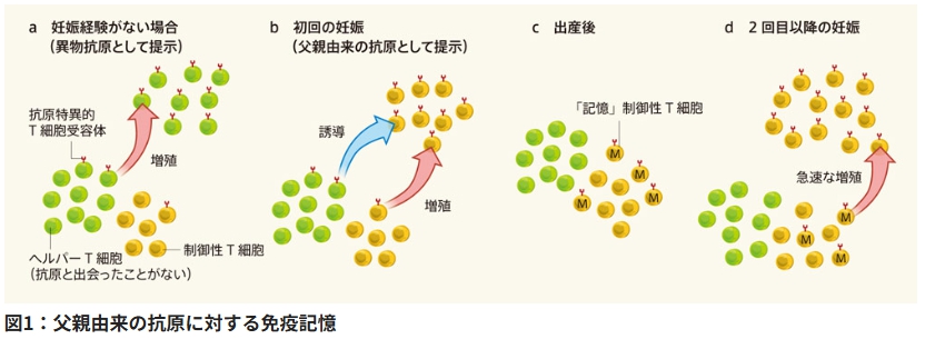 d 父親が同じ場合の2回目以降の妊娠の際には、この「記憶」制御性T細胞が急速に増殖し、同じ胎児抗原に対しすばやく免疫寛容となる。