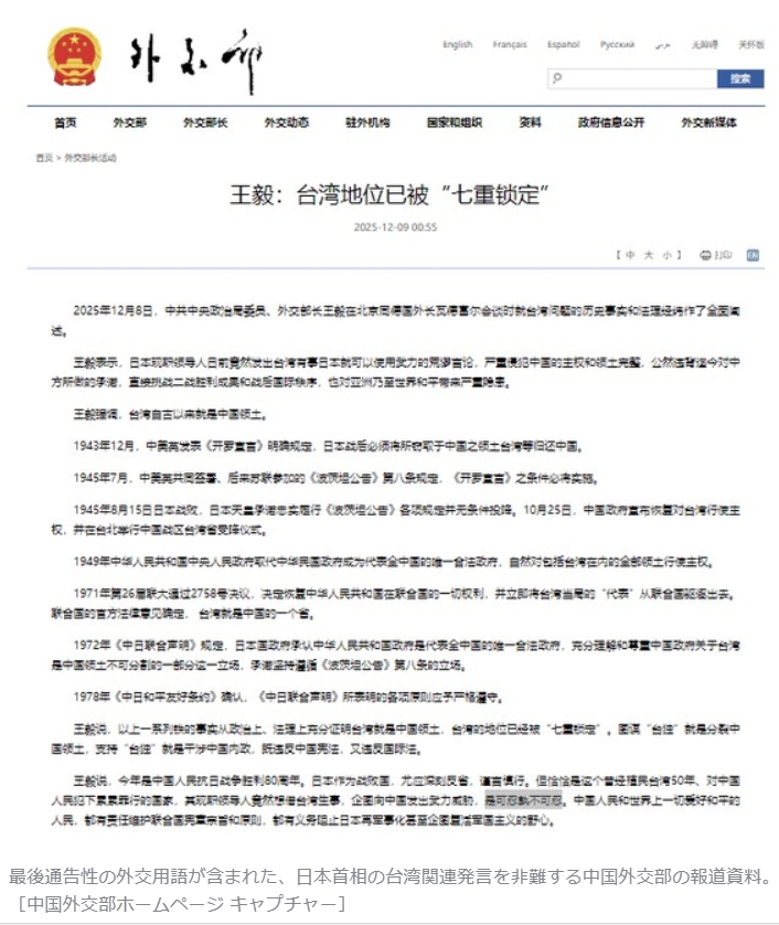 王毅外交部長は8日、北京で行われたドイツのヨハン・ワデフル外相との会談で、日本を狙って「絶対に容認できない(是可忍孰不可忍)」と述べたと中国外交部が発表した。中国外交部は8日午後9時41分にワデフル外相との会談を紹介した後、約3時間後の9日午前0時55分に「王毅:台湾の地位はすでに『七重に固定された』」というタイトルの資料を別途掲載した。