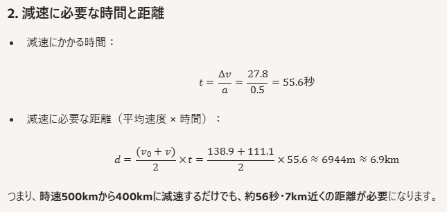想定減速度:リニア中央新幹線の設計上、最大減速度はおおよそ0.5m/s²程度とされています(乗客の安全と快適性を考慮した値)