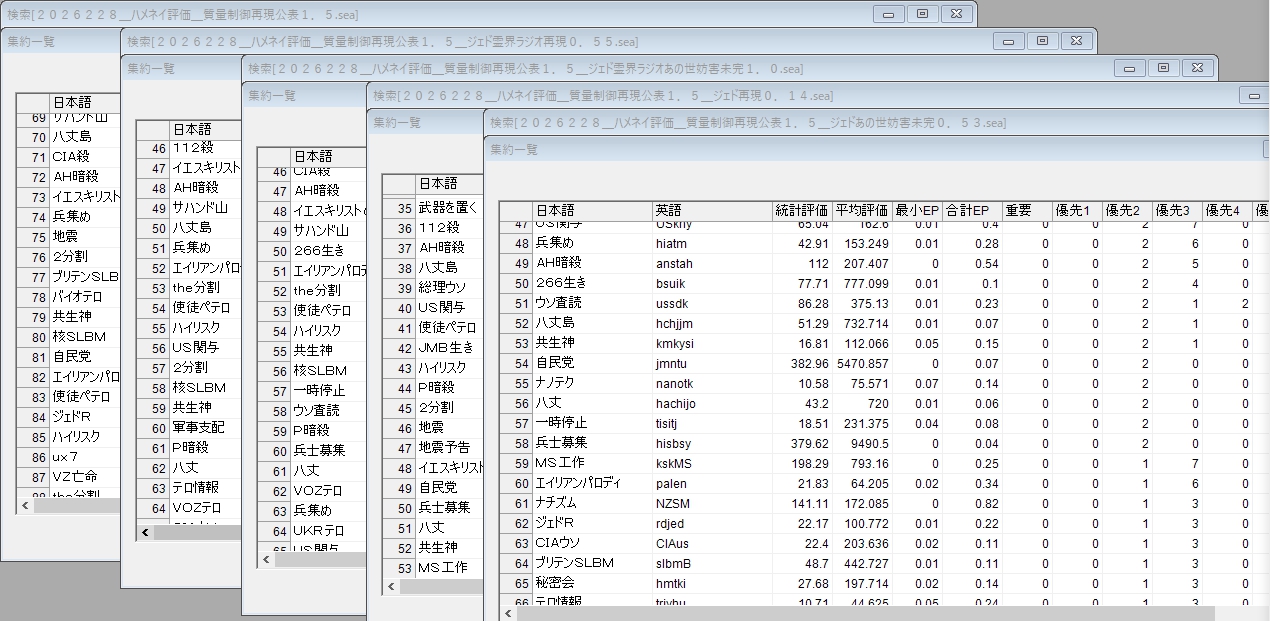 2月28日の解析を行っており、ジェド霊界ラジオ再現とジェド霊界ラジオあの世妨害未完で大きな差が出て欲しかったのですが、この評価では差がないのでした。この理由は、フィルターにしている未来の条件の中で、再現とあの世妨害未完の統計的な評価が、残りのジェド霊界ラジオ部分に大きく負けている結果です。この言葉を減らして、ジェド再現とジェドあの世妨害未完で再評価して、やっと有意な差が出てきたのでした。