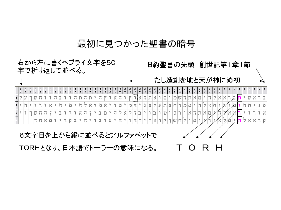 彼の見つけたトーラーは4文字でしたので、彼は4文字を暗号化された文字列と考えたことになります。そうであれば、残りの文字も4文字から探し出せるのではないかと考えました。