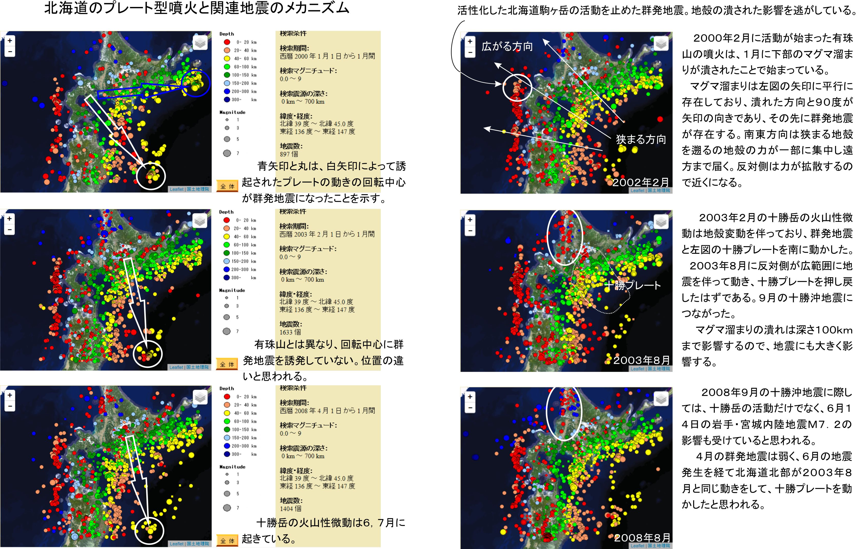 北海道の例は十勝沖の地震を誘発しているので、この部分も解析しています。2003年2月8日に十勝岳が37分間の火山性微動を起こしました。恐らくその前にマグマ溜まりが潰れており、群発地震を誘発しています。群発地震は深さ40~60kmが主な物ですので、この深さで十勝岳から岩手沖まで十勝プレートを動かして進んだのです。