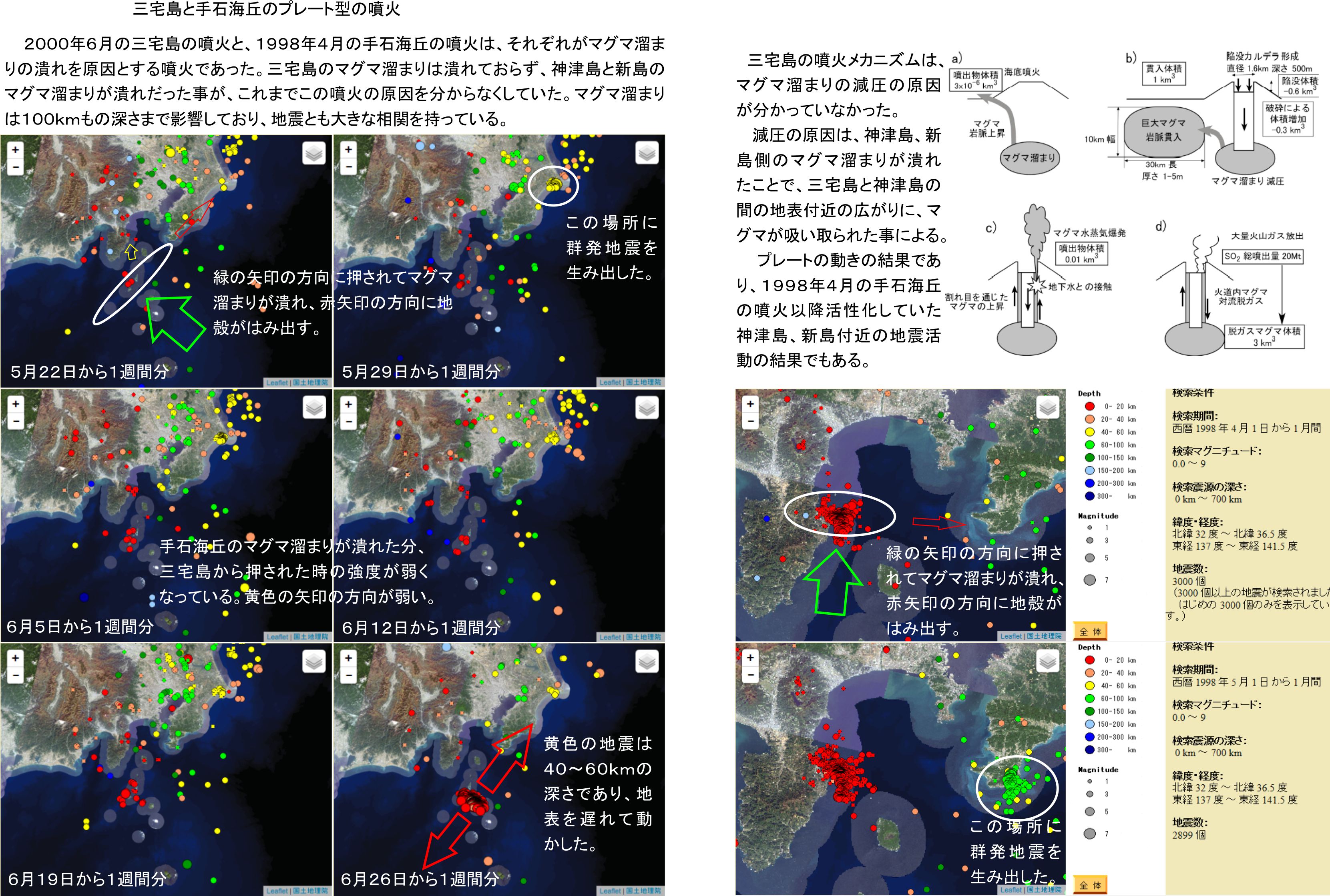 マグマ溜まりの潰れは噴火に関連がありますが、必ずしも噴火につながるわけではなくプレートの運動を惹起して終わるケースもあるようです。今回の三宅島の場合、神津島と新島の下にあるマグマ溜まりが三宅島側から押されて潰れたのだと思われます。