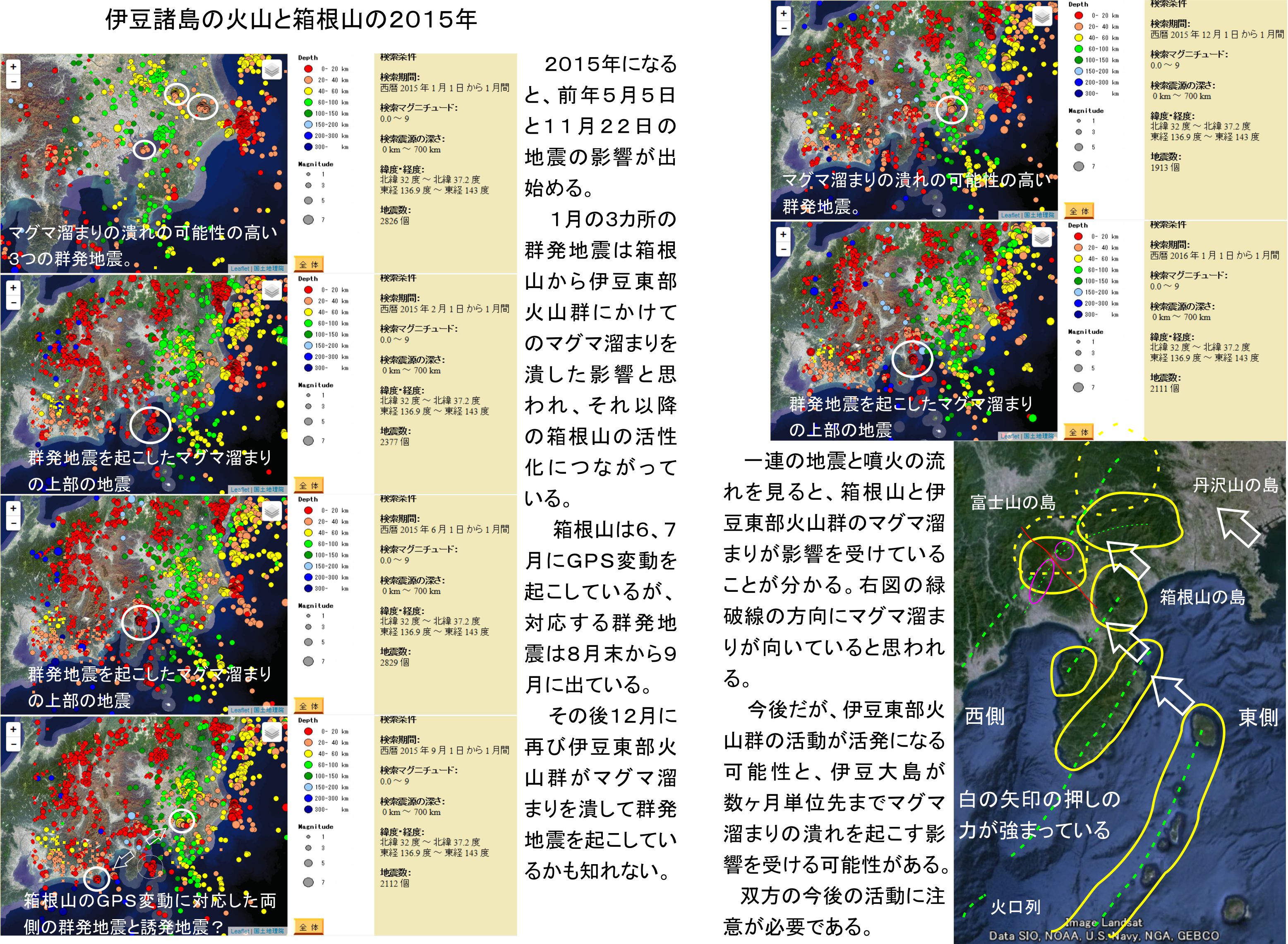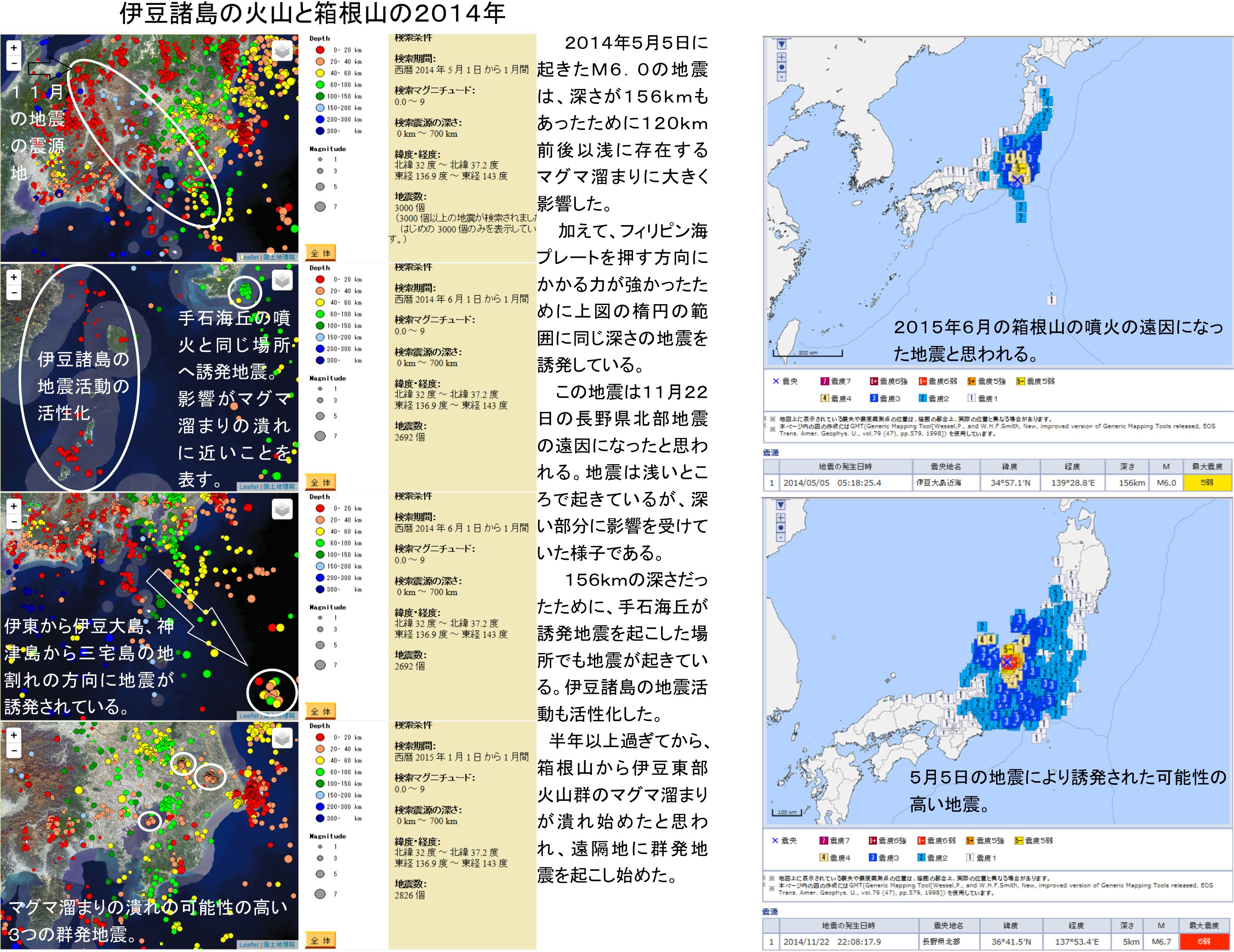 伊豆の関連を遡ると長いお話になると思いますので、ここでは箱根山の噴火に関連する部分を遡ります。2014年の5月5日の伊豆大島北部の地震が、2015年6月の箱根山の噴火につながる変化の始まりであったと思います。