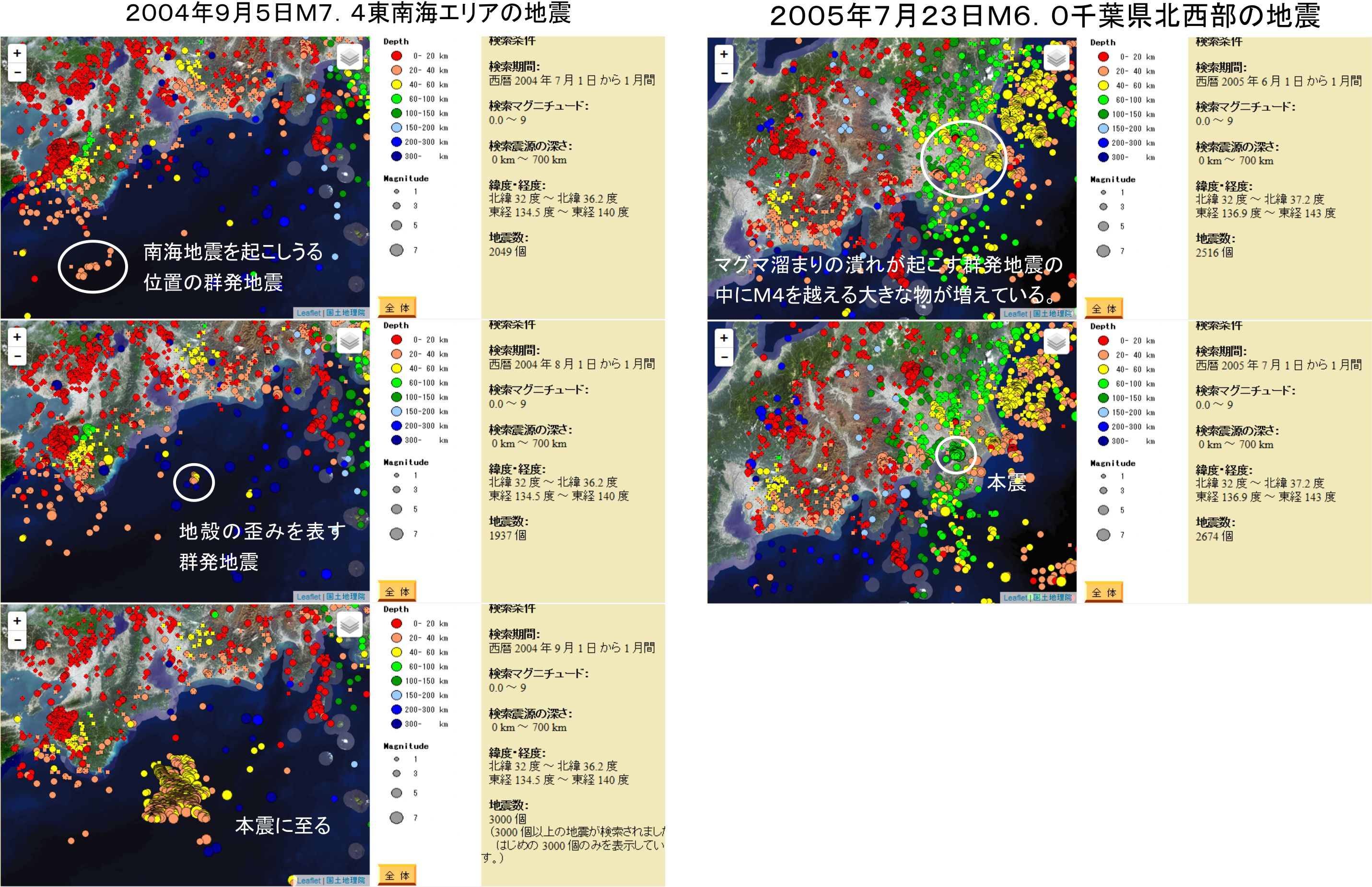 2000年からの地震を調べてみると、2004年9月5日にM7.4の地震が東南海エリアで起きています。この地震が神津島から新島のマグマ溜まりの潰れで起きたと考えると状況を説明します。反対側では関東にM5の地震を多発していました。