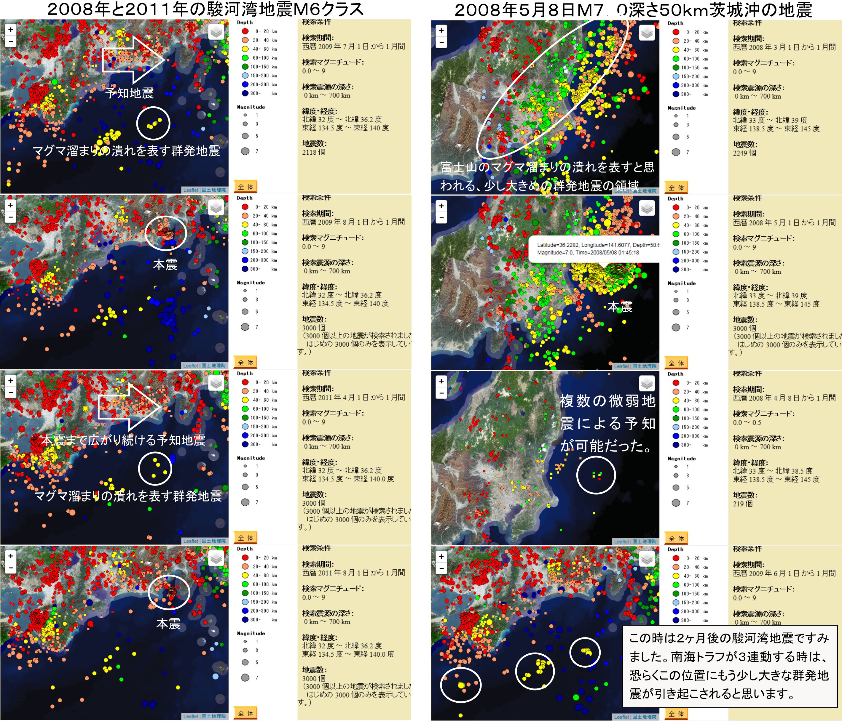 この地震には再発がありました。2011年の311地震により富士山が刺激を受けて3月15日にM6.4の地震を起こしています。この時マグマ溜まりも潰れる刺激を受けており、2009年と同じ群発地震を起こしていました。この時は駿河湾内部にも前兆を思わせる群発地震が起き始めてから8月1日のM6.2の発震となりました。発震までのメカニズムが似ていることを明確に表していると思います。