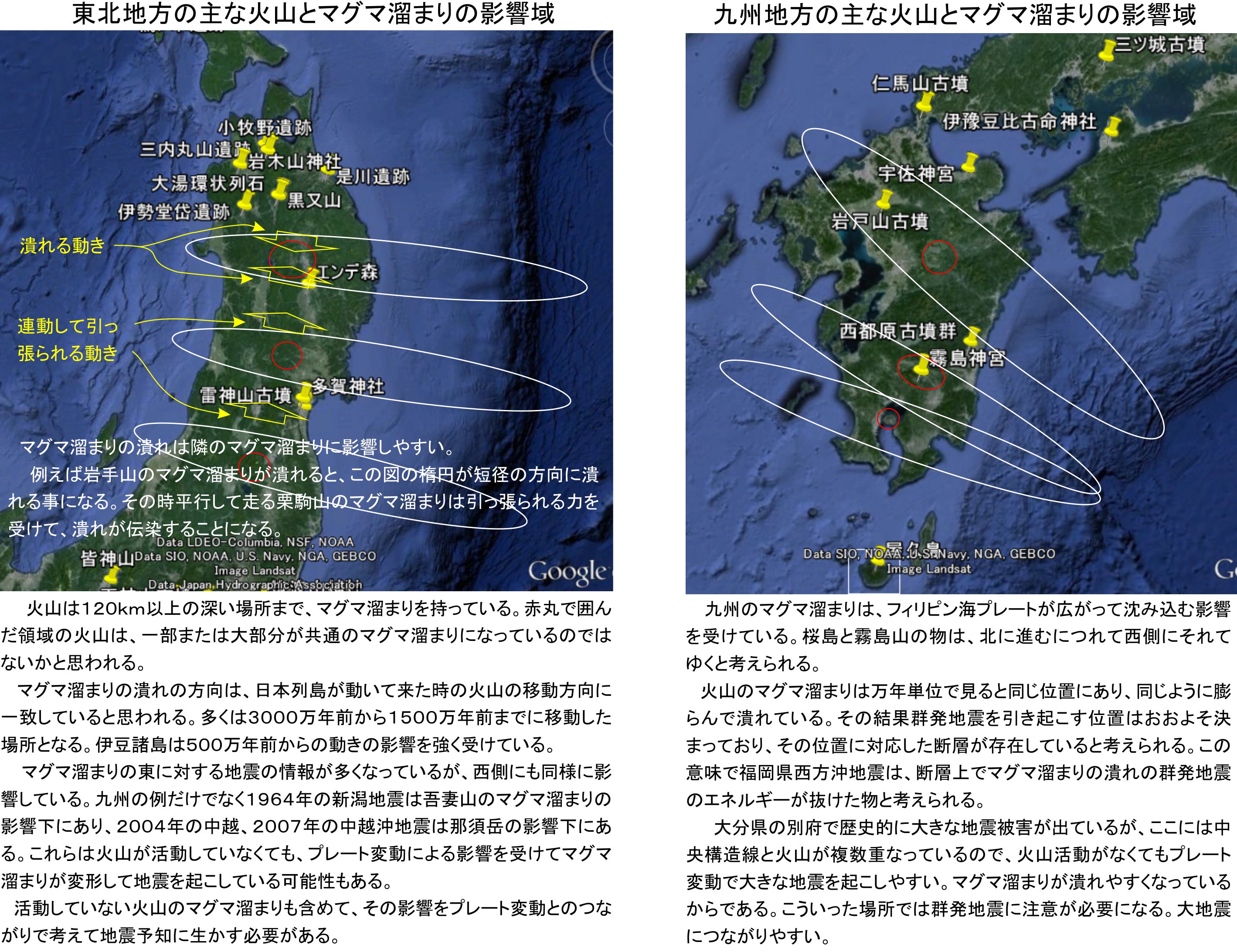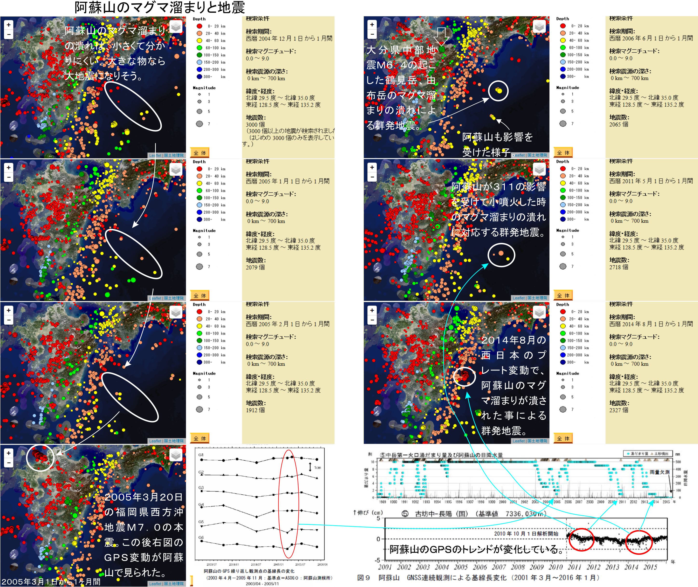 マグマ溜まりの潰れの事例として、九州の物を挙げておきます。2005年3月20日の福島県西方沖地震M7.0は阿蘇山のマグマ溜まりが潰れたと考えると説明できる物になっています。同様に阿蘇山の2011年5月の噴火と2014年の日向灘M6.0と噴火もでした。GPS変動で確認出来る物になります。