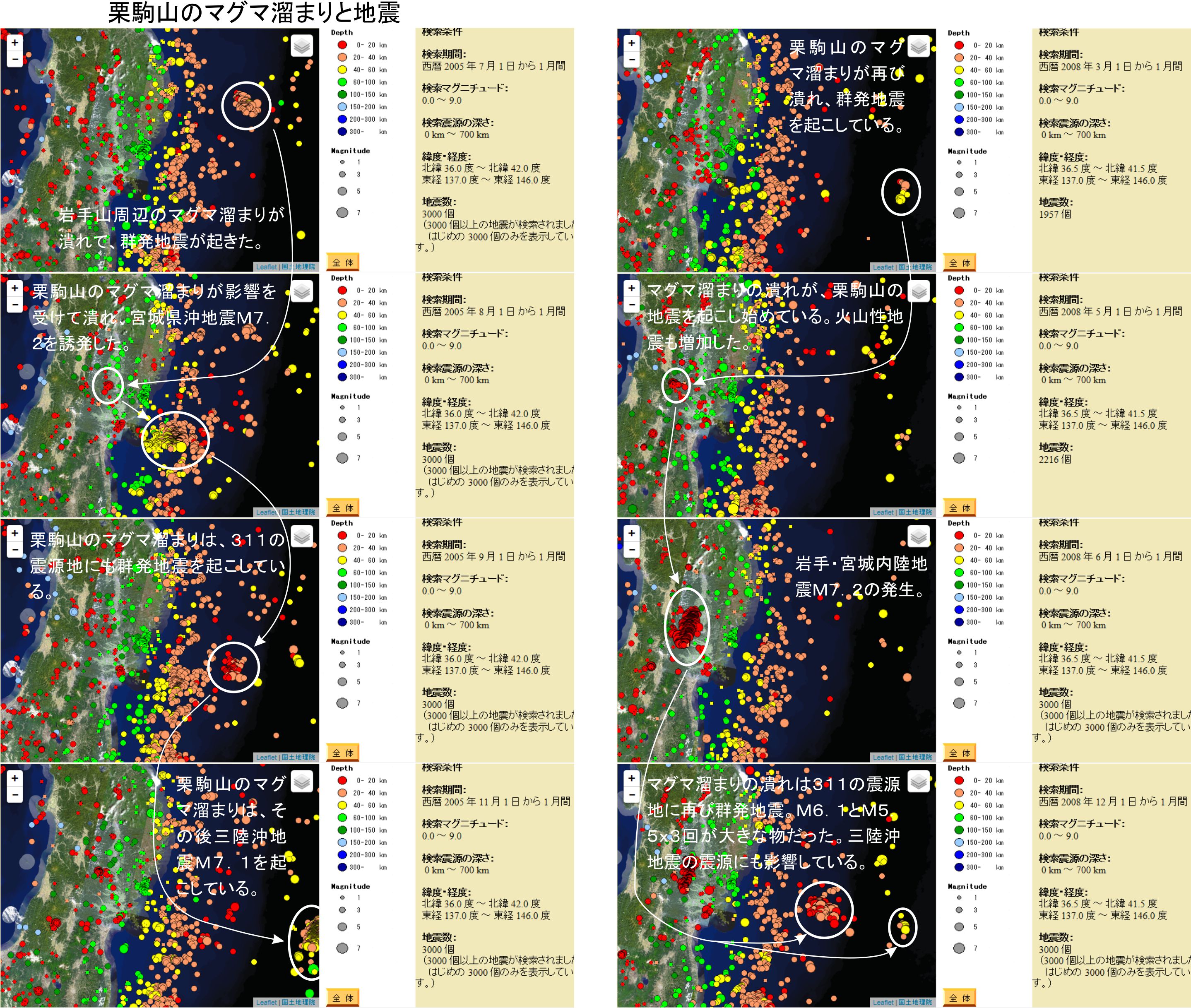 311地震の震源地に群発地震を引き起こしたのは、2005年の栗駒山のマグマ溜まりの潰れです。この時は岩手山か秋田駒ヶ岳の活動が弱くあった様子で、東方沖に群発地震が現れています。その後栗駒山の周辺に地震を誘発してから、8月16日の宮城県沖地震M7.2となりました。この地震はマグマ溜まりの潰れに近い位置ですので、栗駒山のマグマ溜まりの潰れが原因になった可能性が高いと思います。