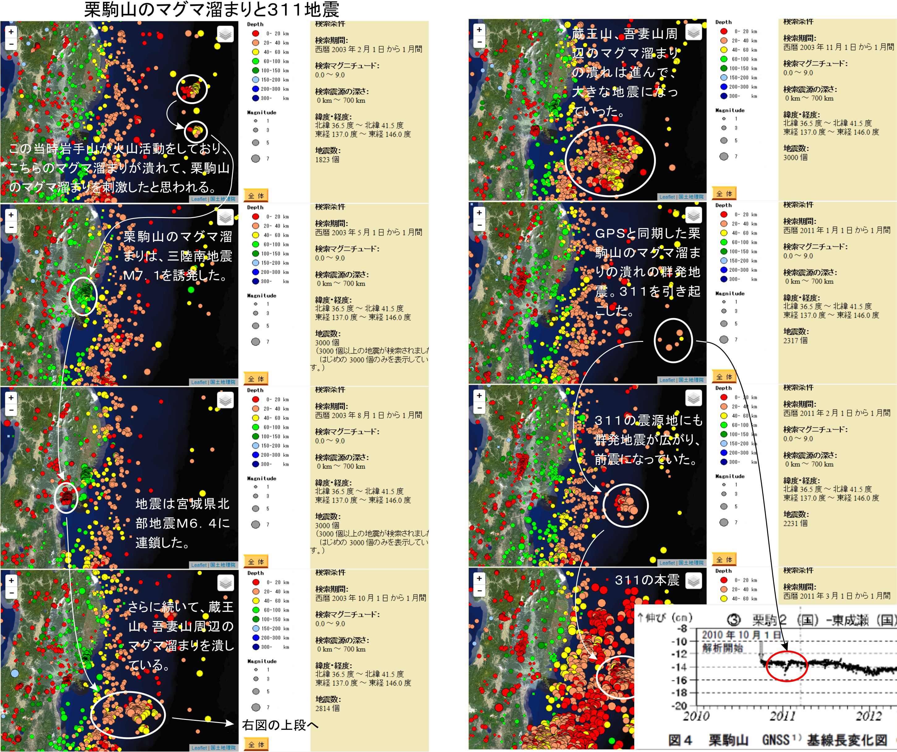 この次は311地震の本番です。イラストの2011年2月に見る様に、311の震源地に群発地震が起きています。1月には弱いながらも三陸沖の震源地に群発地震が起きていますし、計測の始まった栗駒山のGPSの変動にもこの状況が現れていたのです。マグマ溜まりが潰れてその影響の群発地震が起きていることが明らかだったのです。