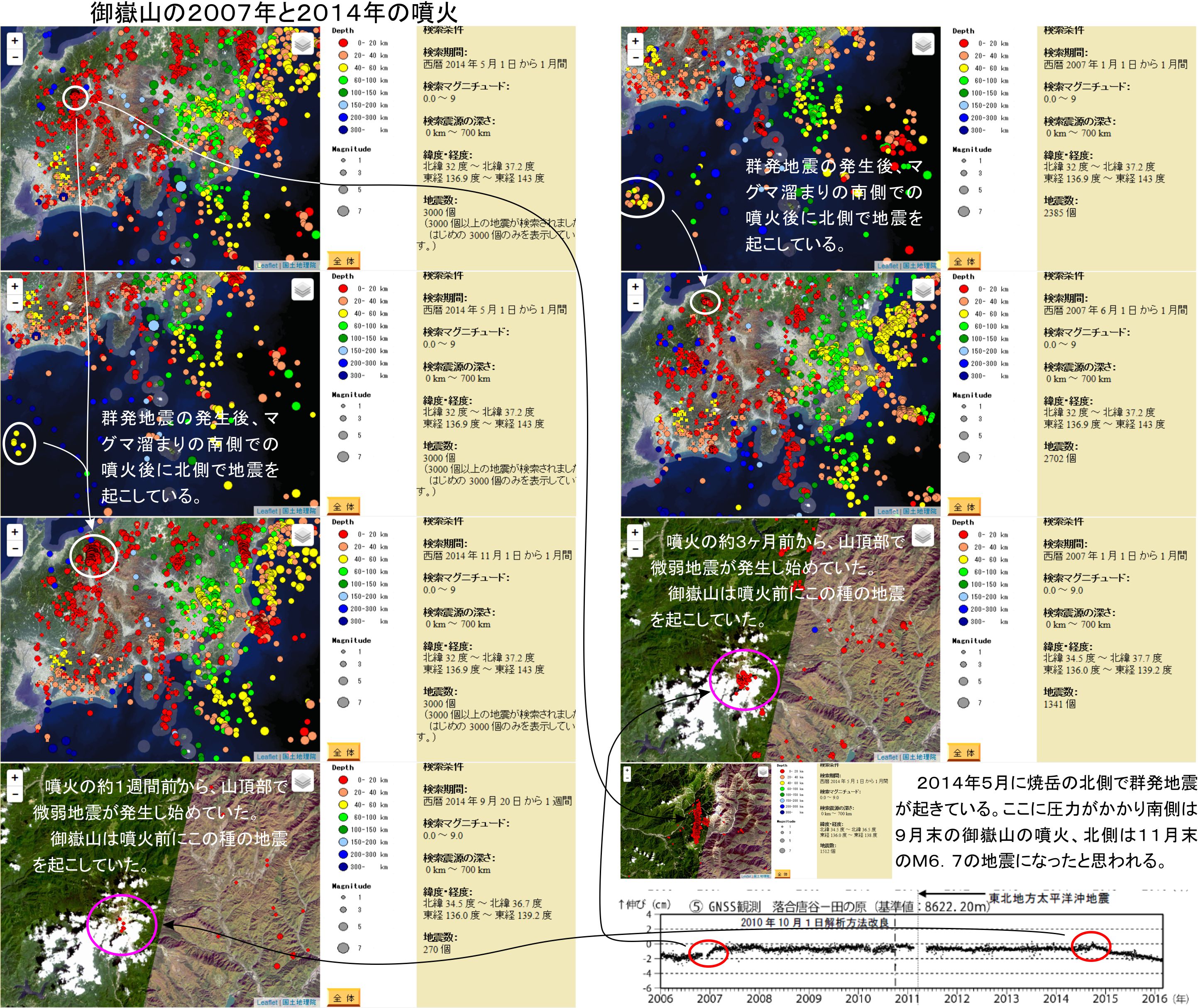 御嶽山の噴火は2007年にも起きていました。この噴火の際の実績のデーターを元にマグマ溜まりの潰れのメカニズムで御嶽山の噴火と関連地震を評価していれば、御嶽山の噴火だけでなく、その後に起きた長野県神城断層地震も予知が出来ていたと思います。