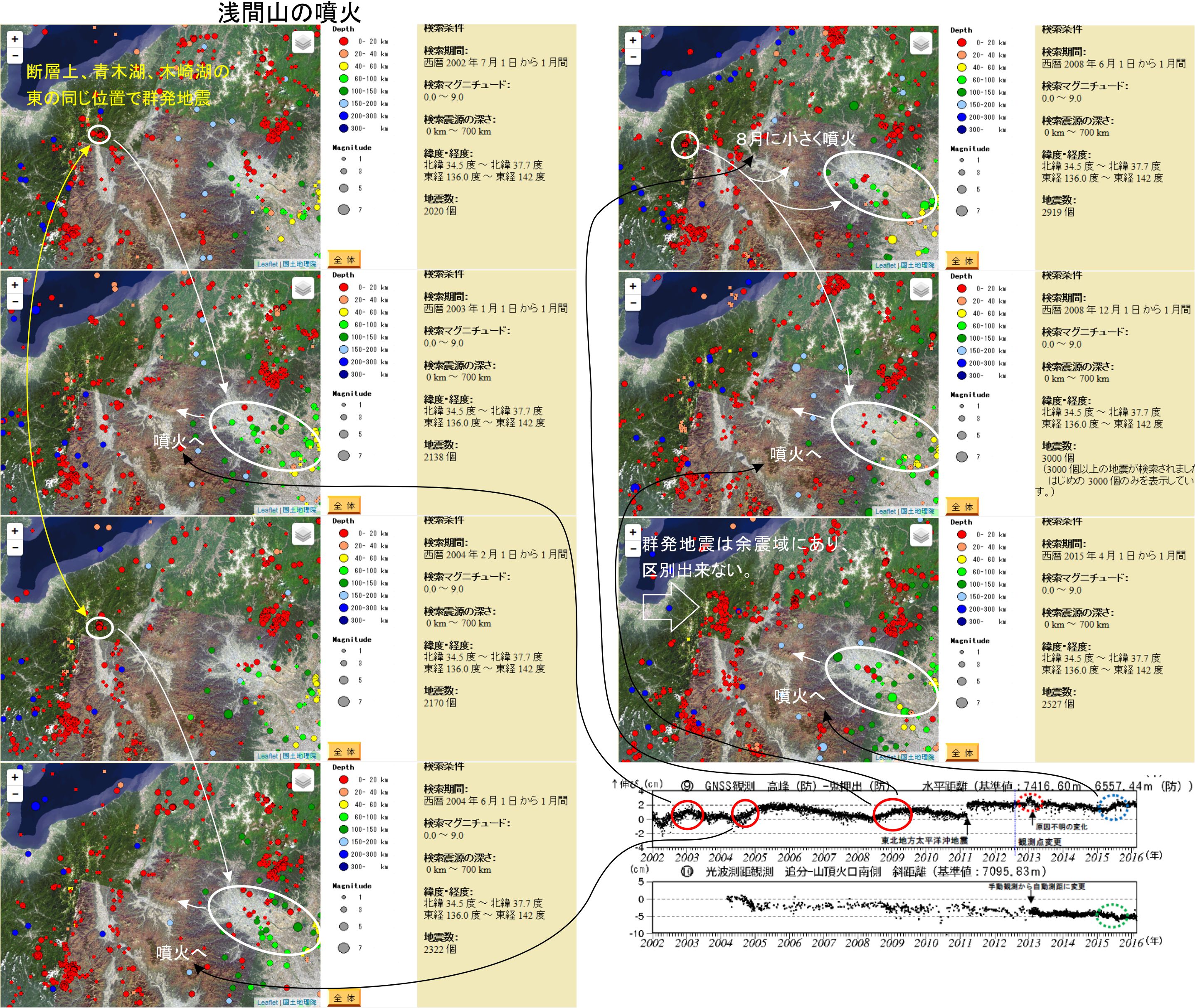 比較のために浅間山のデーターも載せておきます。GPS変動で山体が膨らむと噴火に至りやすい様子です。事前に引き起こされる群発地震は偶然にも狭い範囲の同じ場所で起きており、断層も存在する中での繰り返し現象でした。木崎湖と青木湖の東側になります。
