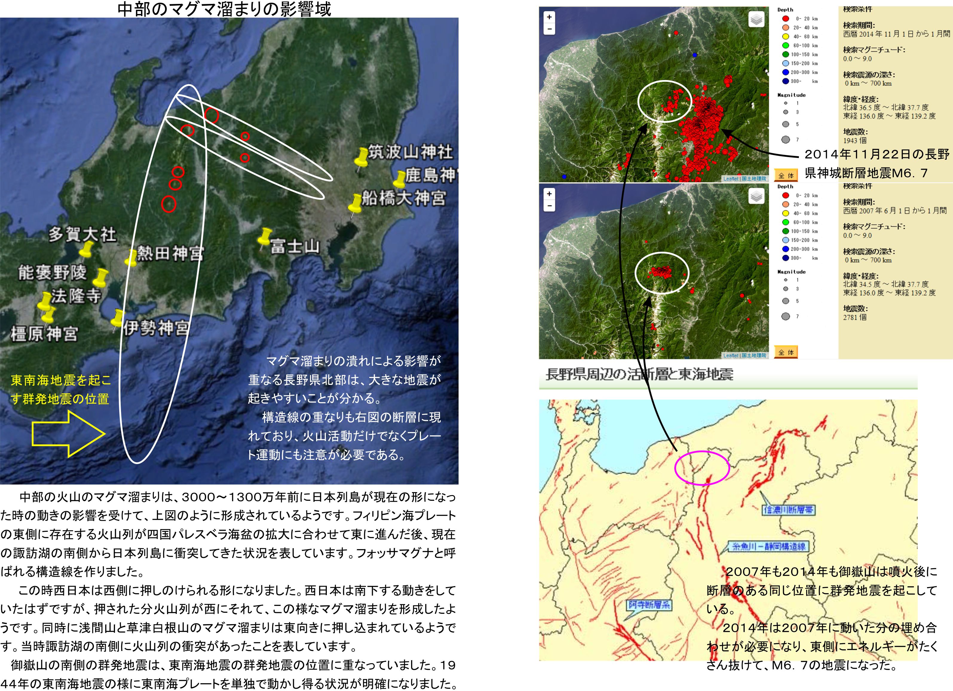 この位置に群発地震が起きるのは、マグマ溜まりの潰れが諏訪湖から愛知県の構造線に添った物になる結果であると思われます。海底にも当時のフィリピン海プレートの衝突の地形的特徴が線になって残されており、中央構造線の延長線である事を示唆しています。