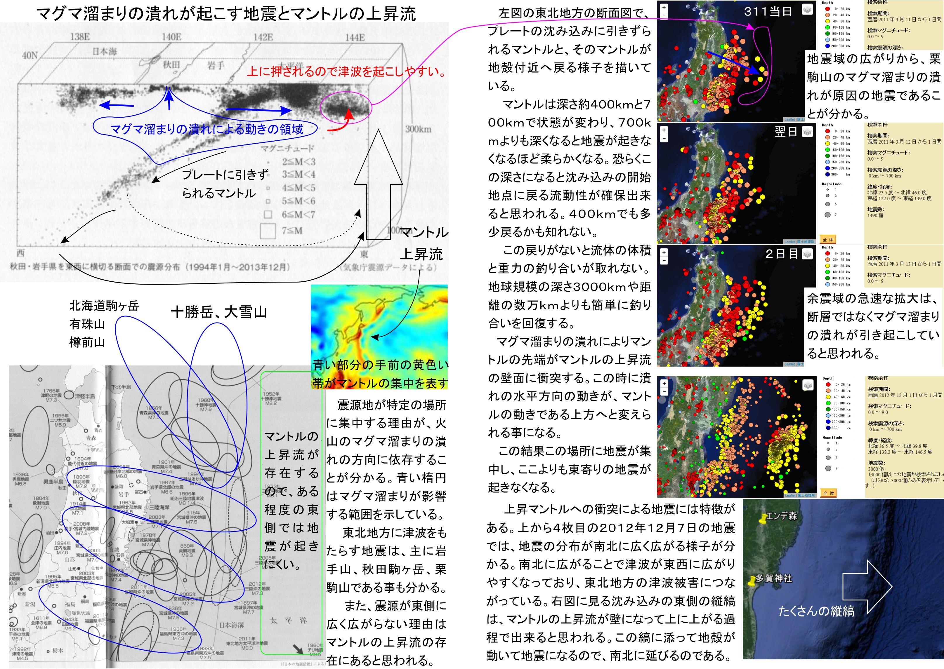 マントルの上昇流の領域に余震に見える地震を引き起こしてきたのは、東北の火山のマグマ溜まりが311地震の影響で潰れる他の変動を受けた結果と思われます。これまでなされてきた普通の地震のメカニズムでは説明出来ないでしょう。そしてマントルの上昇流は流体の補流という補う流れであり、マントルが熱で対流していないことを表してもいます。熱による対流は古い時代に考えられた物であり、未だに実証されていない仮説です。