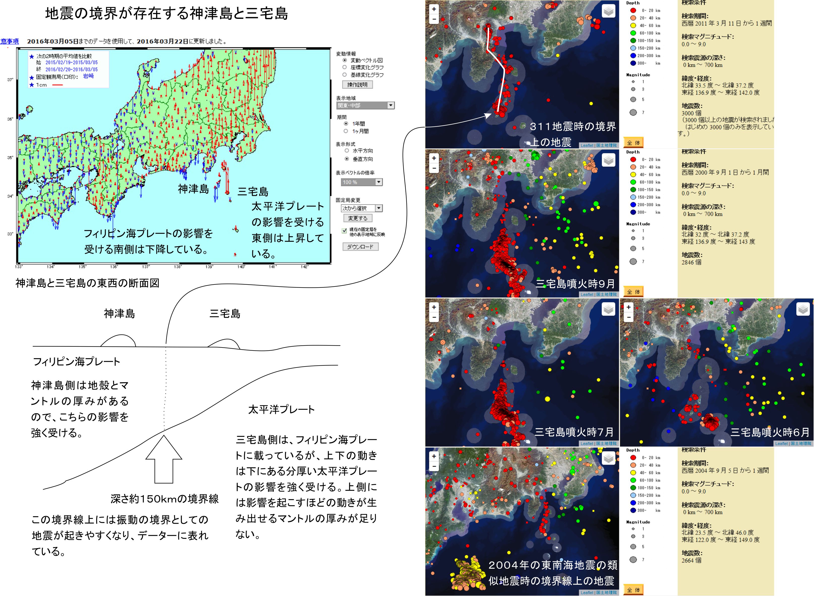 その結果ですが、上下の動きにおいて神津島はフィリピン海プレートの動きに主に支配されており、三宅島は太平洋プレートの動きに主に支配されています。地震波は上下の動きを抜きに出来ないので、地震その物にもこの状況が生まれるのです。