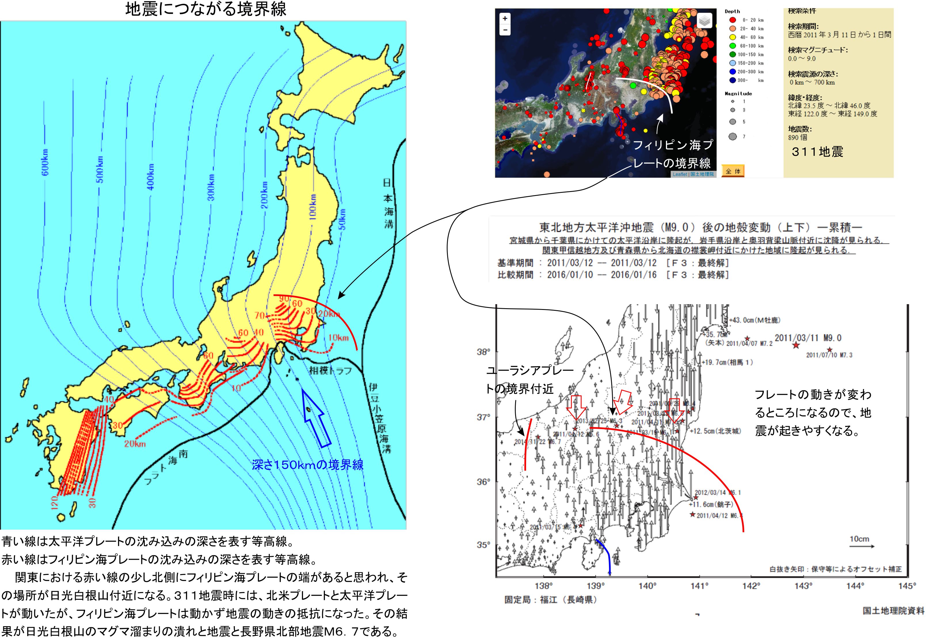 防災科学技術研究所のイラストに、フィリピン海プレートの一部が赤色で書かれています。現在計測出来ている部分であり実際にはもう少し北側にまで広がっており、その影響の途切れるところが日光白根山付近と考えられます。