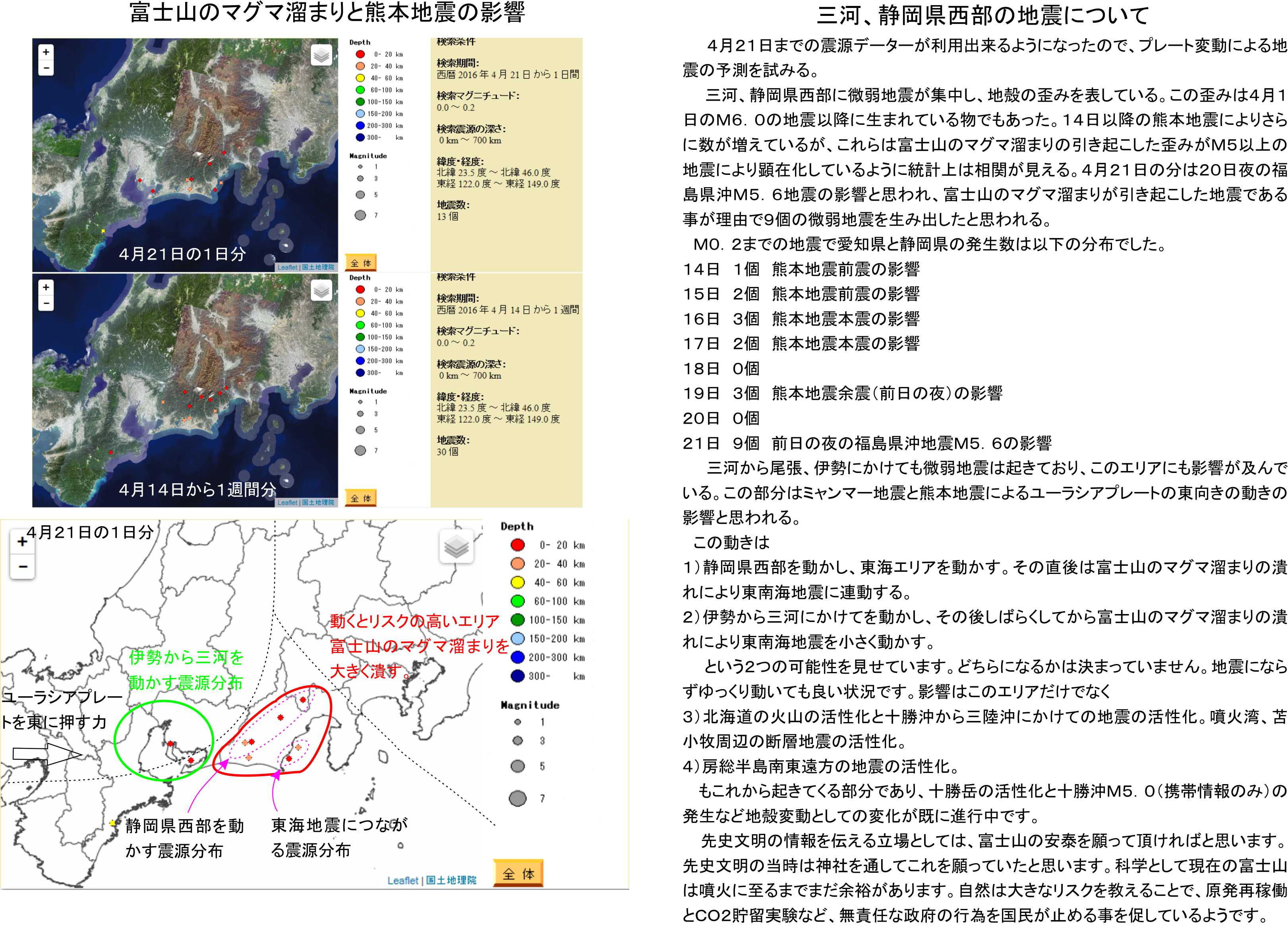 微弱地震の評価が適切に出来ていなかったので、富士山のマグマ溜まりの影響の大きさが理解出来ていませんでした。ここに来てやっと状況が飲み込めたので、この先の変化の可能性を公表する事で、マグマ溜まりの潰れによるメカニズムだけでなく、プレート変動によるメカニズムとの組み合わせをきちんと説明出来るようになると思います。