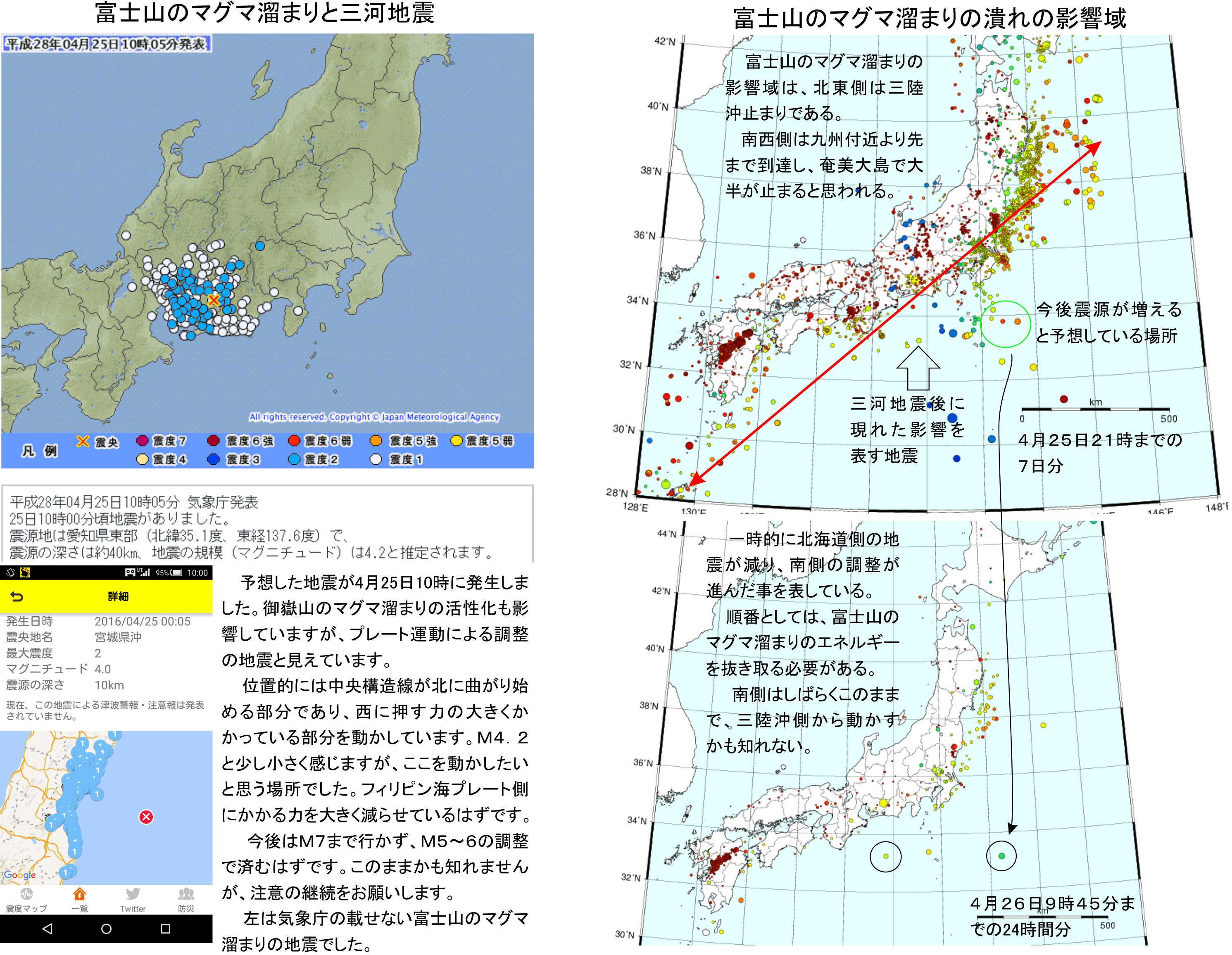 ミャンマー地震と熊本地震がユーラシアプレートを東に動かす働きをしていますが、それ以上に富士山のマグマ溜まりの潰れの影響は大きな物でした。311地震時の状況と比較しても当時は1日微弱地震を抑制出来ただけでしたが、今回はデーターの確認出来る21日まで4月1日から21日間も止まったままです。