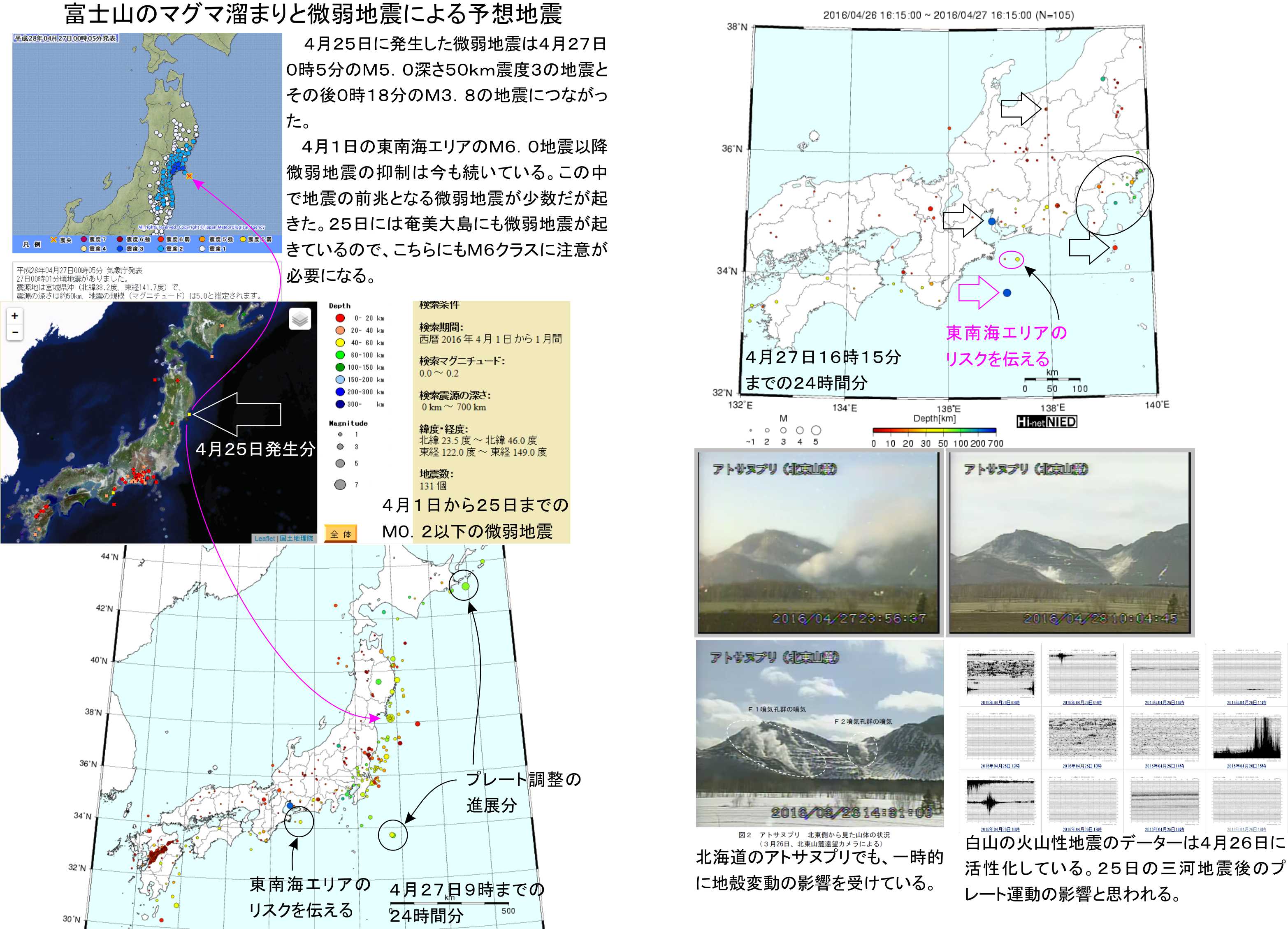 マグマ溜まりの関連メカニズムとして、火山の噴火を当てられた物はまだ阿蘇山だけです。明確な火山性地震の増加などの火山活動の活性化については、阿蘇山に加えて霧島山、樽前山となりました。十勝岳も噴煙が高まった時に火山性の地震を増やしていると思います。こちらは気象庁の評価待ちで、十勝岳の群発地震は増えています。