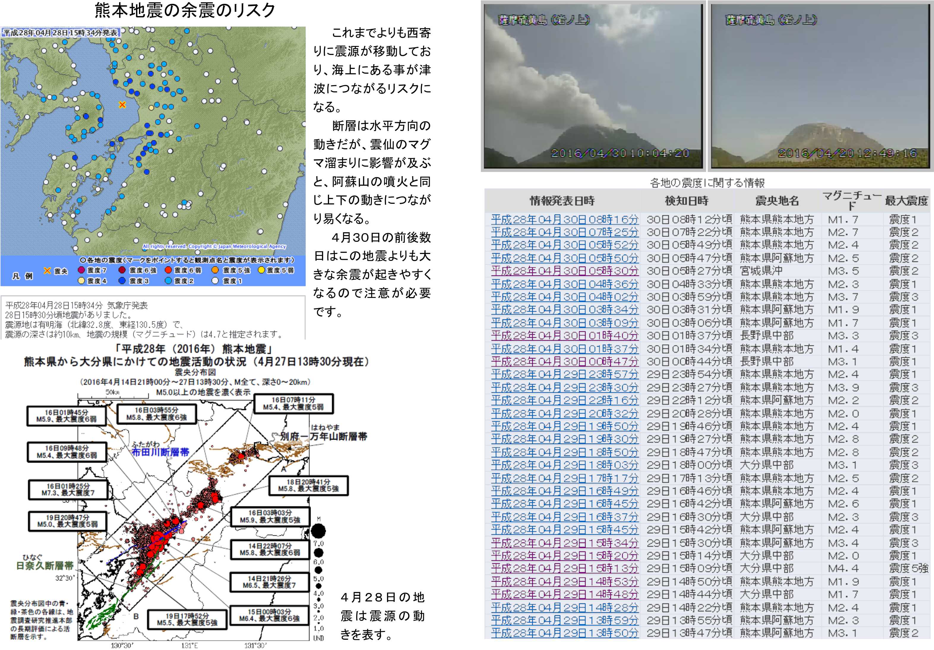 もう一つの心配がこの地震には現れており、震源が西に向かって移動するだけでなく海上に出ていることです。断層として水平の動きになるので津波は本来誘発されにくいのですが、このエリアには雲仙岳のマグマ溜まりが存在しています。この部分が刺激を受けると上下の動きを伴いやすくなります。上下の動きは阿蘇山においては噴火に至ったエネルギーになりますので、今後の動きに注意が必要です。揺れに慣れてしまっていると思いますので注意を呼びかけたい状況です。