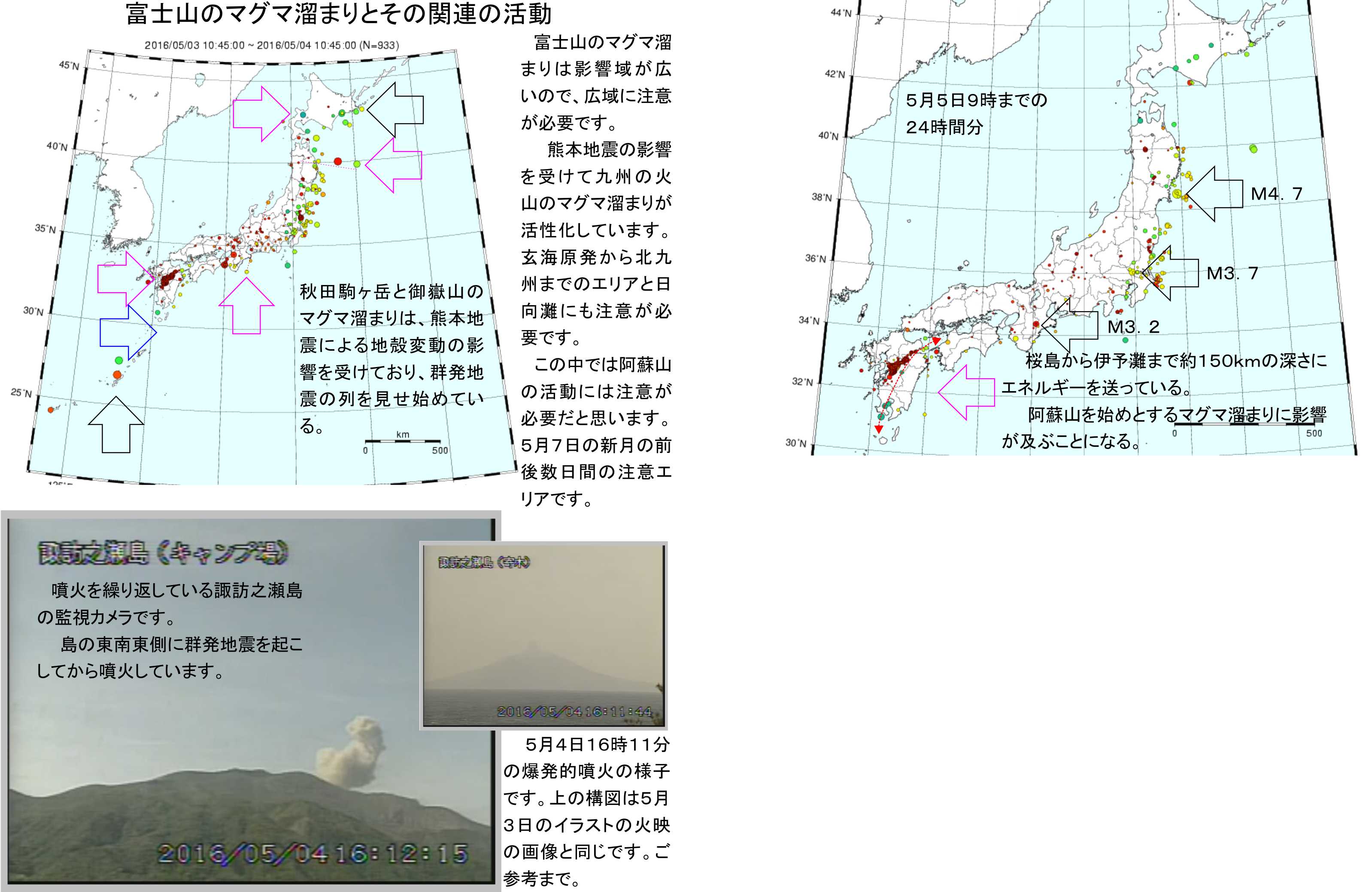 5月5日の微弱地震は静岡の分が戻ってきた以外に2つ増えていました。一つは中央構造線と御嶽山のマグマ溜まりの交点付近です。この位置だと新月で強まる分M5前後で揺れるかも知れません。もう一つは網代付近であり、伊豆東部火山群の活性を表している物と思われます。富士山のマグマ溜まりは活性で、日本の微弱地震を抑止し続けています。