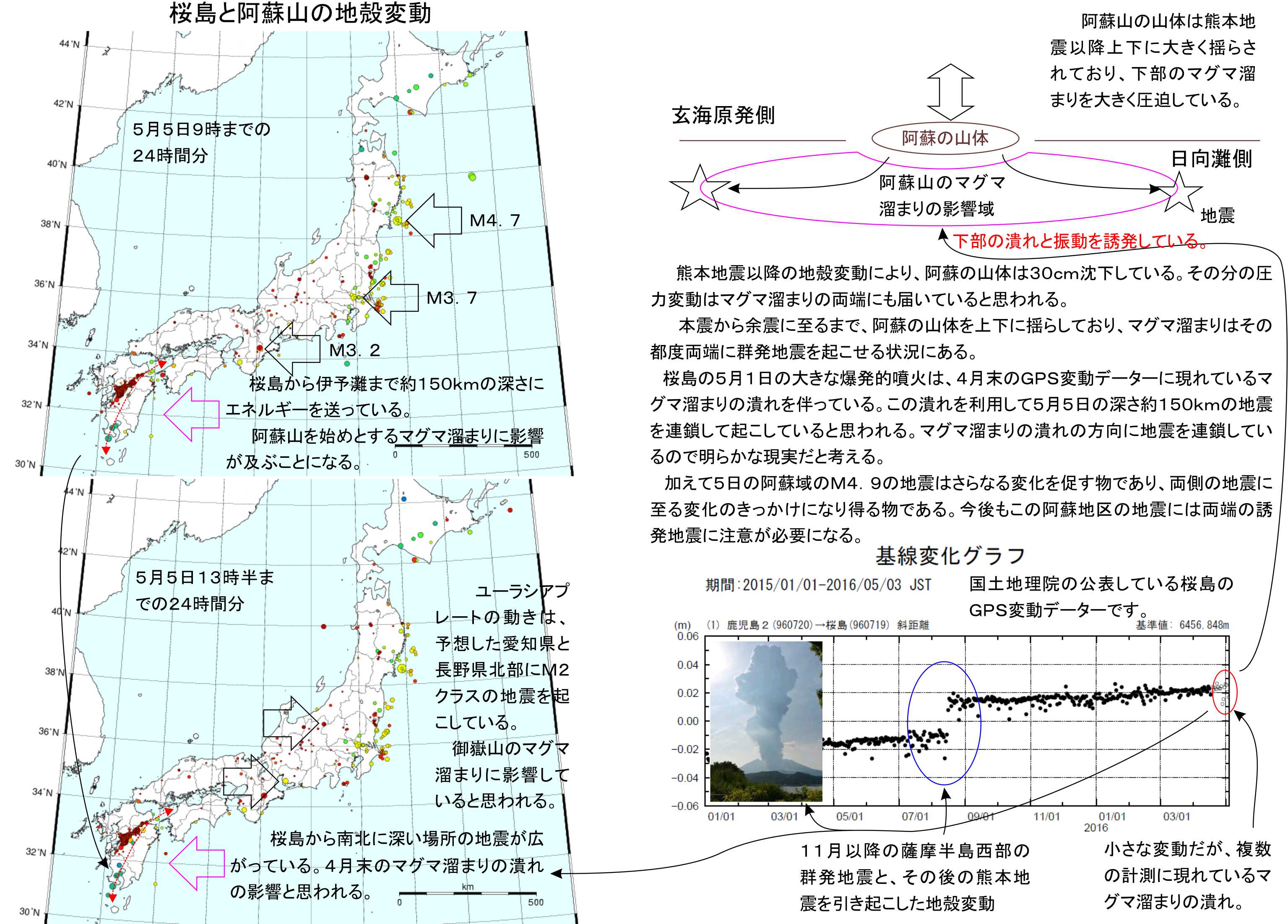 桜島は5月1日に歴代7位の4.1kmの噴煙を上げています。爆発的噴火による大きな活動でした。この時の状況を調べてみたところ、4月末にGPS変動データーにマグマ溜まりの潰れを示唆する動きが2カ所に現れていました。桜島はこの動きに合わせて噴火活動を活性化し、1日の爆発的噴火に至った様子です。