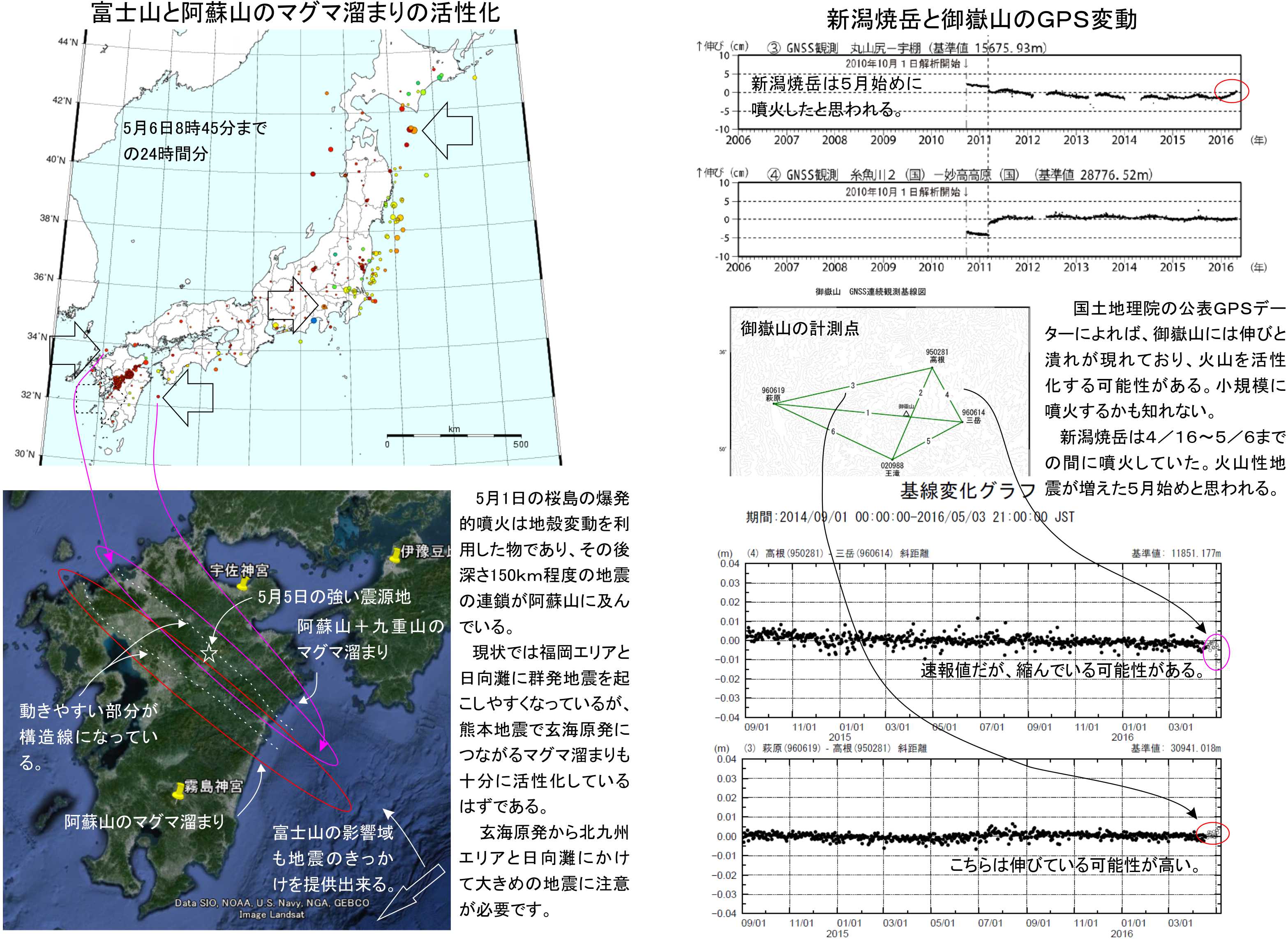 同時に公表されたGPSのデーターには山体の膨らみを表す変動が表れていました。4月の始めから変動が現れ始めており、14日以降の熊本地震の影響も加わって噴火に至った物と思われます。新潟焼岳はGPSデーターが1ヶ月に一度しか公表されないので、こちらが変動に気づく前に噴火したという状況です。
