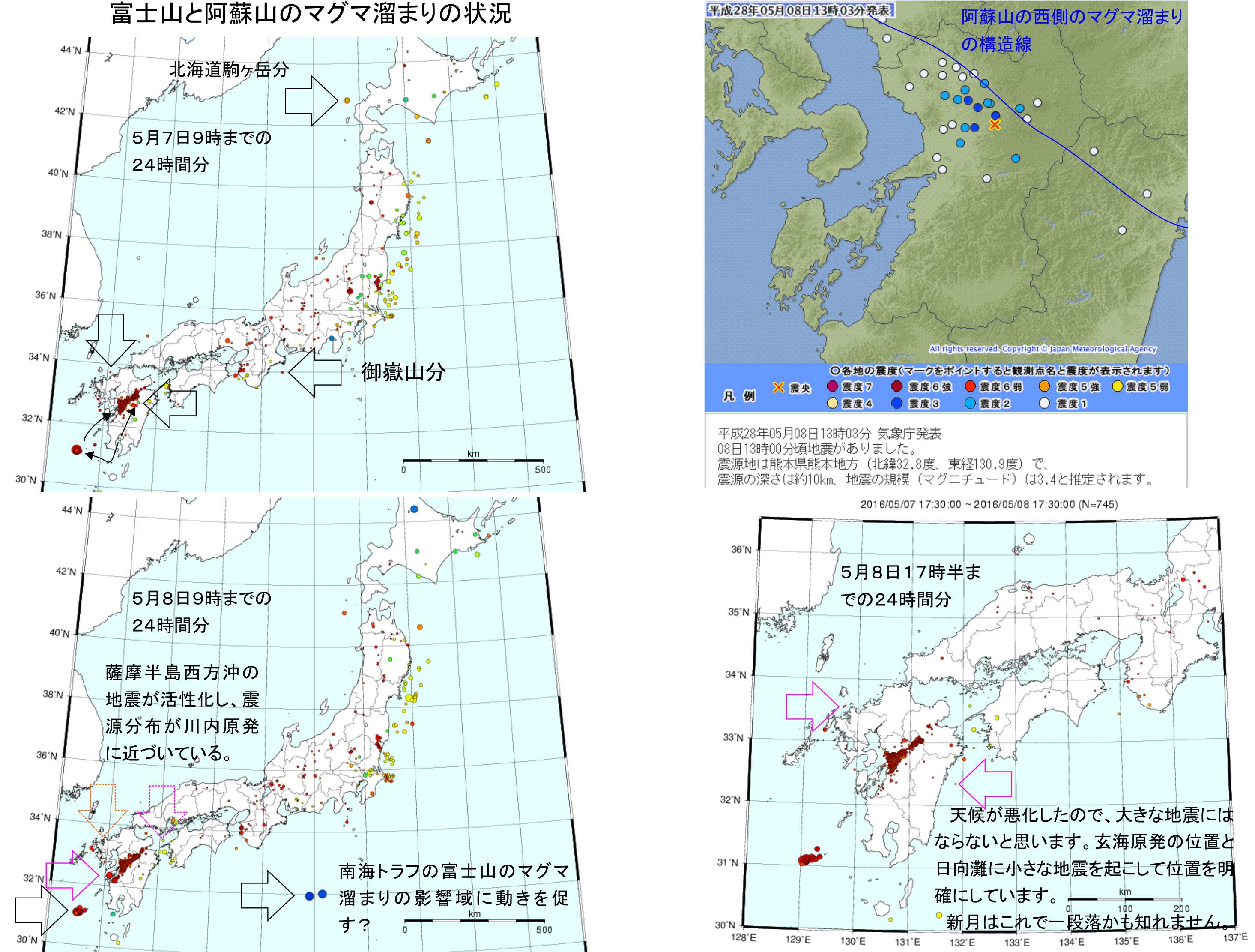 普段はこういった現実は理解されないので書かないのですが、今回は特別なのでここまで書いています。7日前後の玄海原発付近の地震に関して、偽善側の動きを今回の余震同様に牽制するためです。こちらの予想では阿蘇山のマグマ溜まりの潰れに関連して、玄海原発側か、日向灘側に少し大きめの地震が起きる可能性がある現状です。
