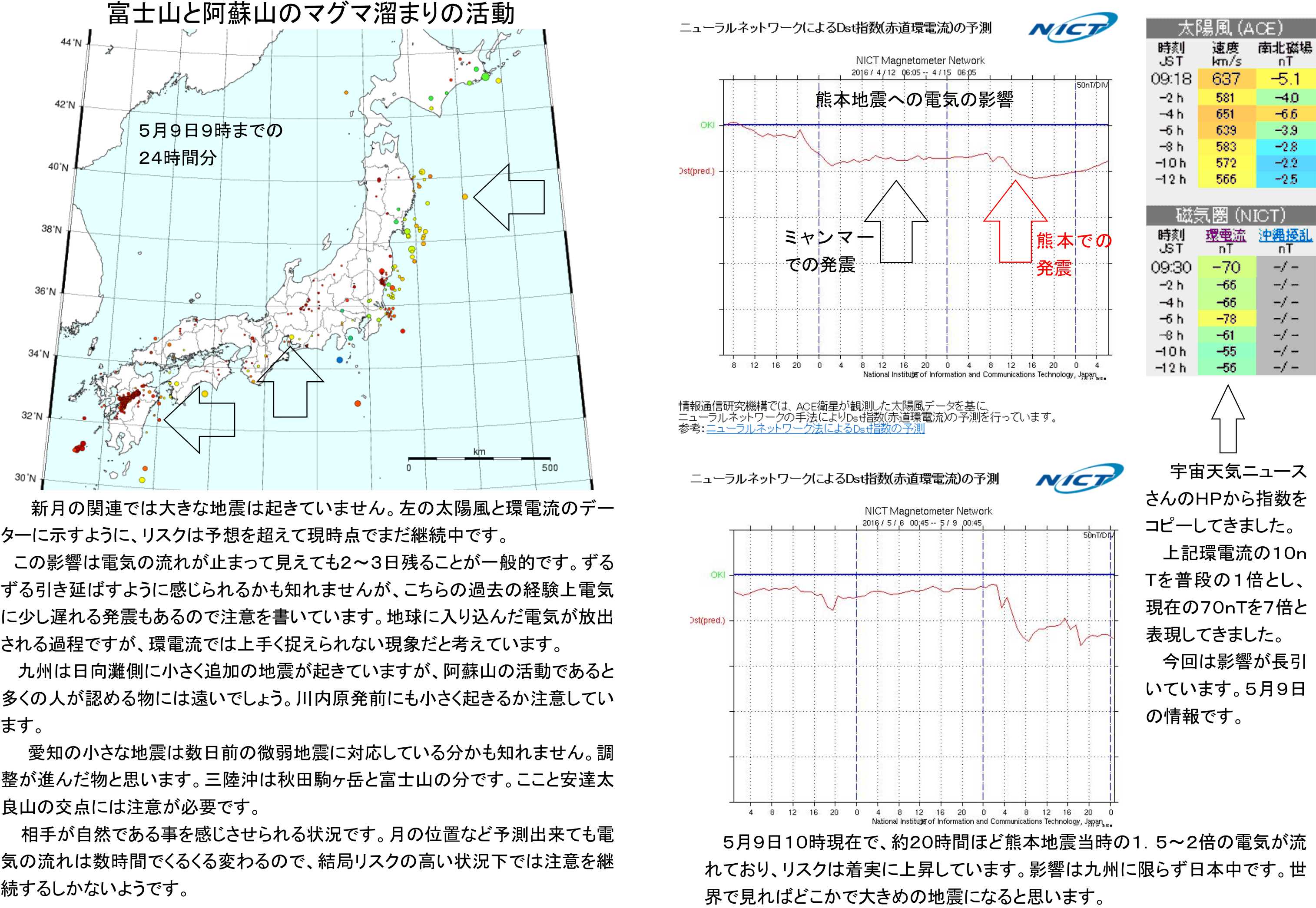 5月8日の微弱地震は静岡エリアに加えて三河に一つと三重県北部の山沿いに一つでした。どちらも中央構造線の関連部分と思われ、このエリアの調整地震に可能性があります。ここしばらく大きな地震につながらなくなっているので、この抑制が今も効いていると考えると現状でも大きくてM5程度だと思います。熊本地震ではなく富士山が抑制していると思えてきています。