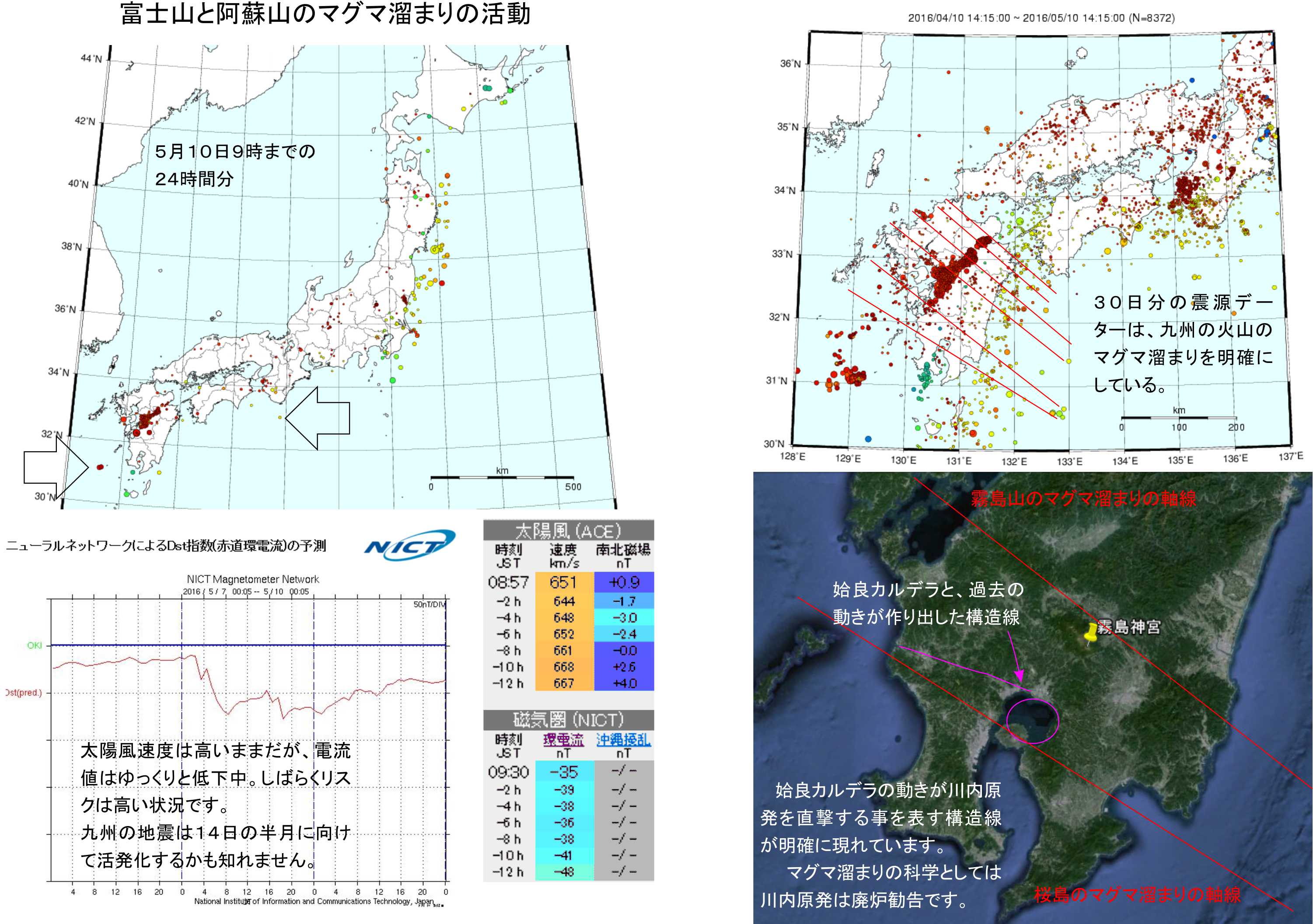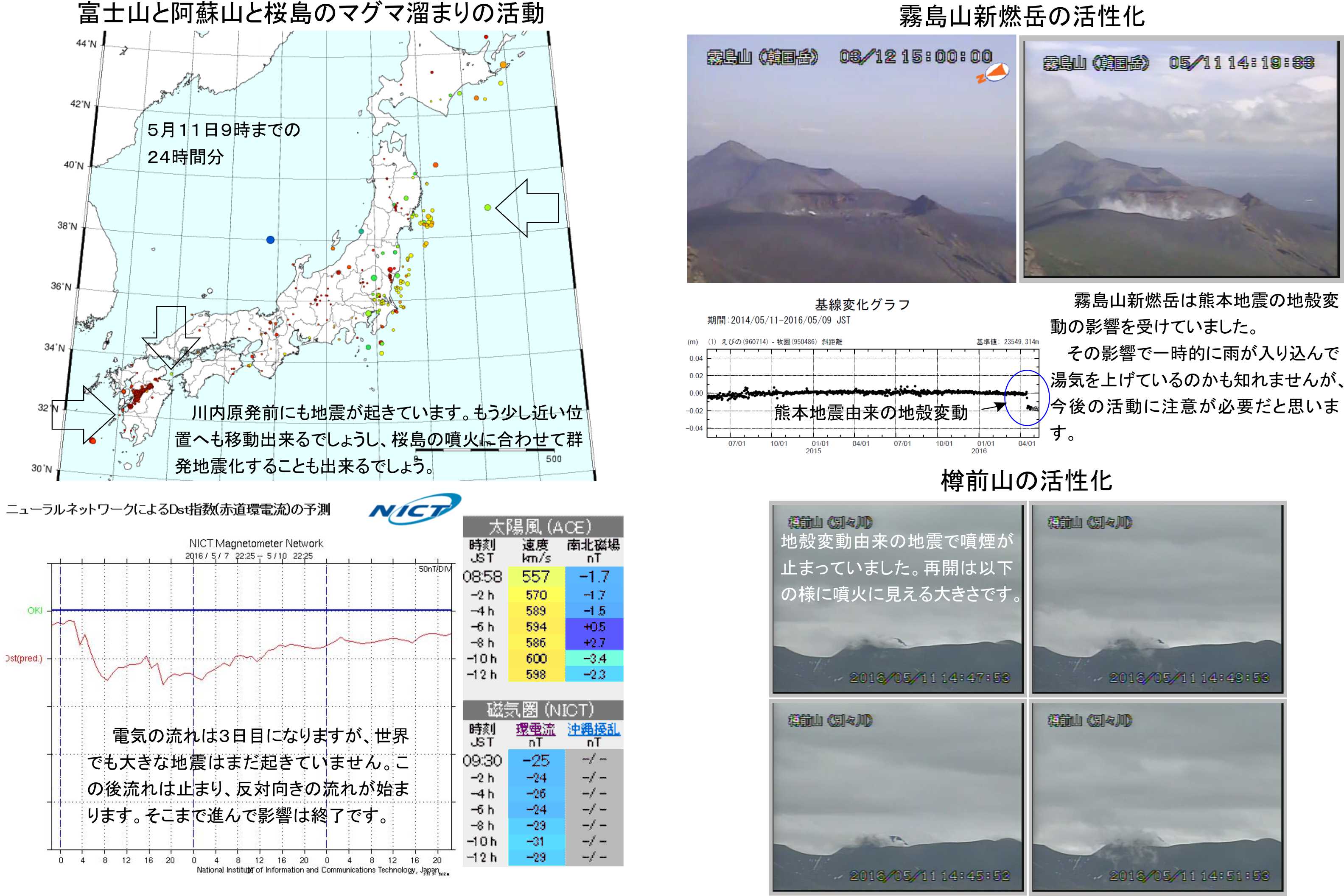 歪みのエネルギーを解放する良い機会なのか、それとも被害を起こす大きな余震の発生になるのか区別がつかない状況です。今のところ遠隔地の群発地震に向けた動きは小さいので、阿蘇地区での揺れにつながるエネルギー解放であり大きめの余震のリスクの方が強いと感じています。本震から約1ヶ月であり同じ引力の条件になるので熊本地区も含めて余震には注意が必要です。熊本地区は阿蘇地区ほど歪みをため込む物(マグマ溜まり)が存在しないので、これまでの地震で調整が進んでいると思います。念のための注意です。