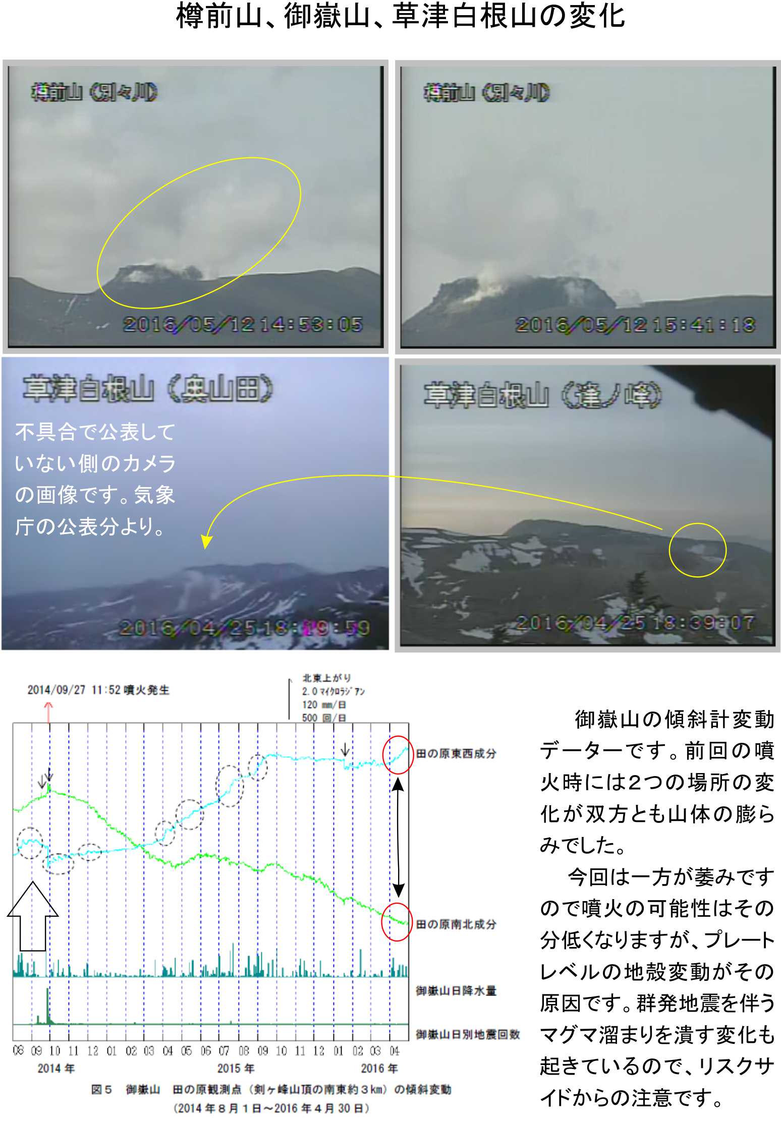 本日は火山の4月の活動が公表になり、2点ほどこちらの関心のある部分がありました。草津白根山も4月25日に噴煙を上げていました。この活性化は予想した物であり、当時噴煙と思われる画像も撮っていました。この時は同時に起きている雲の発生と区別がつかなかったので、公表しませんでした。周辺の群発地震による火山の活性化の例として樽前山と霧島山に続く実例になりました。