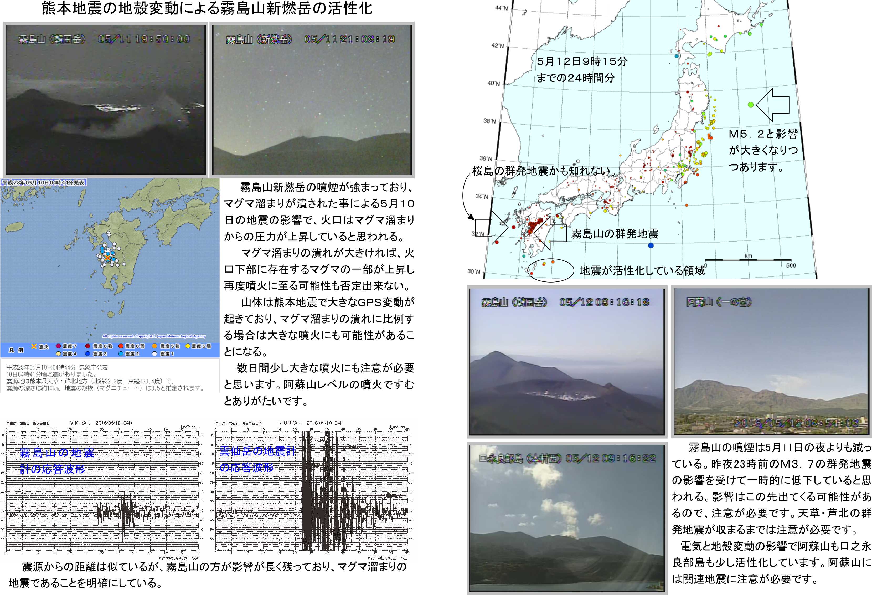 本日の変化に対して影響が大きいと思われる物は、昨日5月10日のM3.5の地震です。この影響でマグマ溜まりの潰れが進んだのかも知れないと思います。震源の天草・芦北より似た距離の雲仙岳と霧島山の地震波形を火山の地震計から比較しました。雲仙岳の方が強く揺れているのに、速やかに減衰しています。これに対して霧島山では揺れが大きさを保って長く揺れています。マグマ溜まりの揺れが霧島山につながっているので火山下部の共振が起きてエネルギーの減衰が少なかったのだと思われます。分かりにくい表現ですみませんが、霧島山のマグマ溜まりの潰れが起こした地震であるという特徴があるという事です。