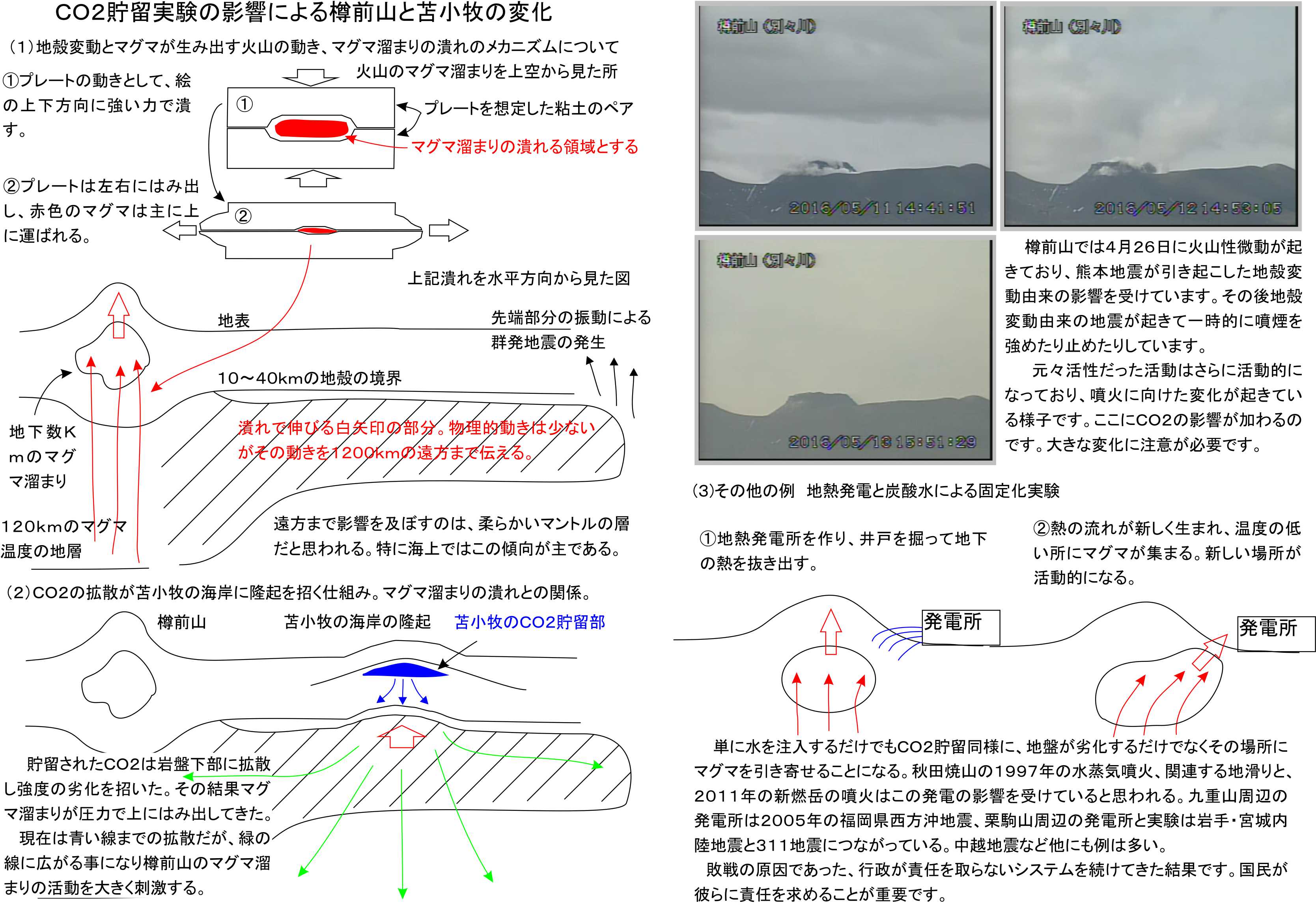 現在苫小牧でも実施中の実験ですが、この場所は近傍の樽前山の噴火につながる変化になりやすいでしょう。CO2の貯留事業は全て停止し、注入済みのCO2も回収すべきです。地盤の劣化は簡単には戻らず以後の地震を大きくするでしょう。