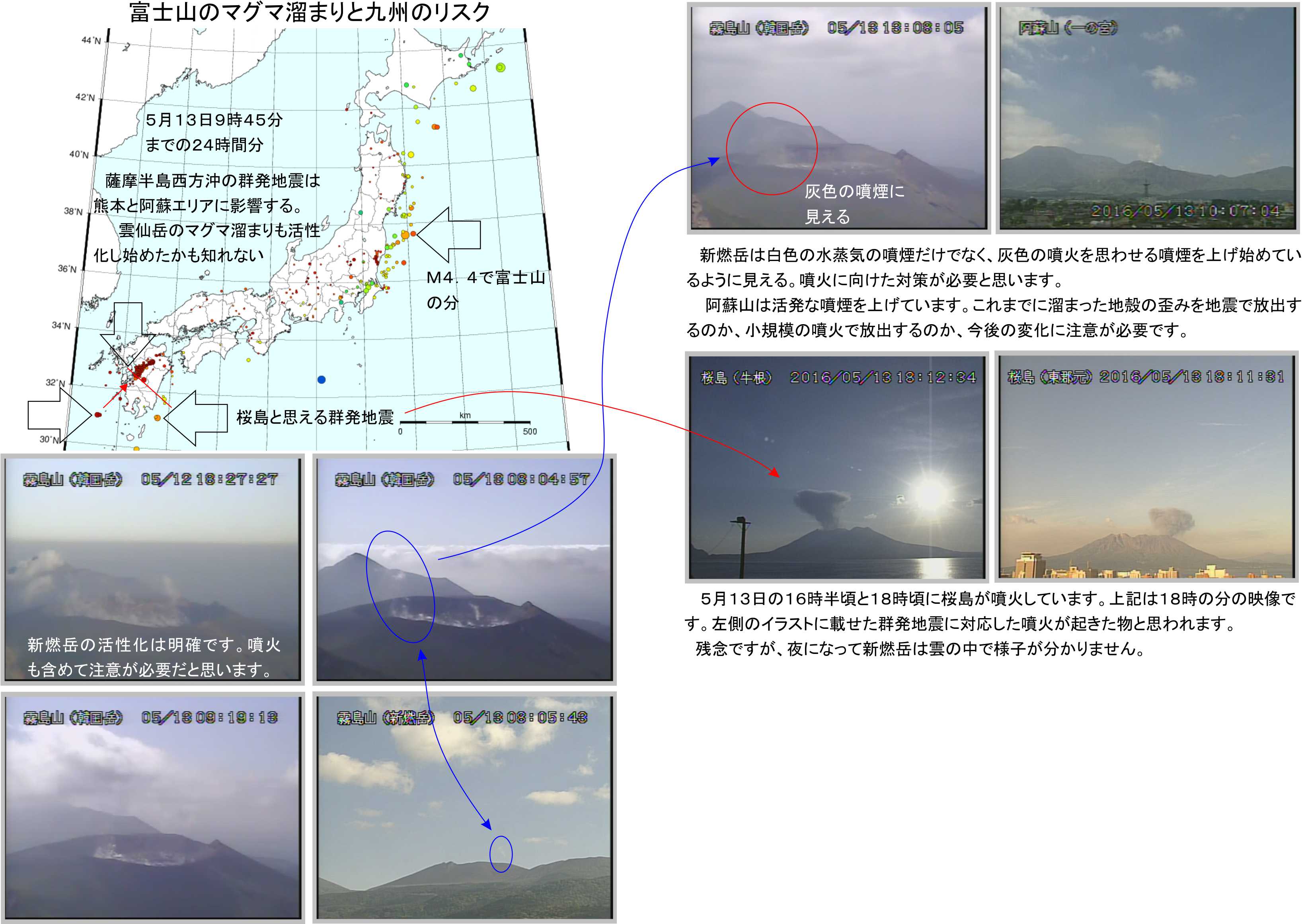 本震からも1ヶ月ほど時間がたち、余震の発生パターンも明確になってきました。次の下弦の半月である29日の前後が次の大きめのリスクになります。マグマ溜まりの異変他余震が起きそうな状況を見つけた時にはここに書きたいと思います。