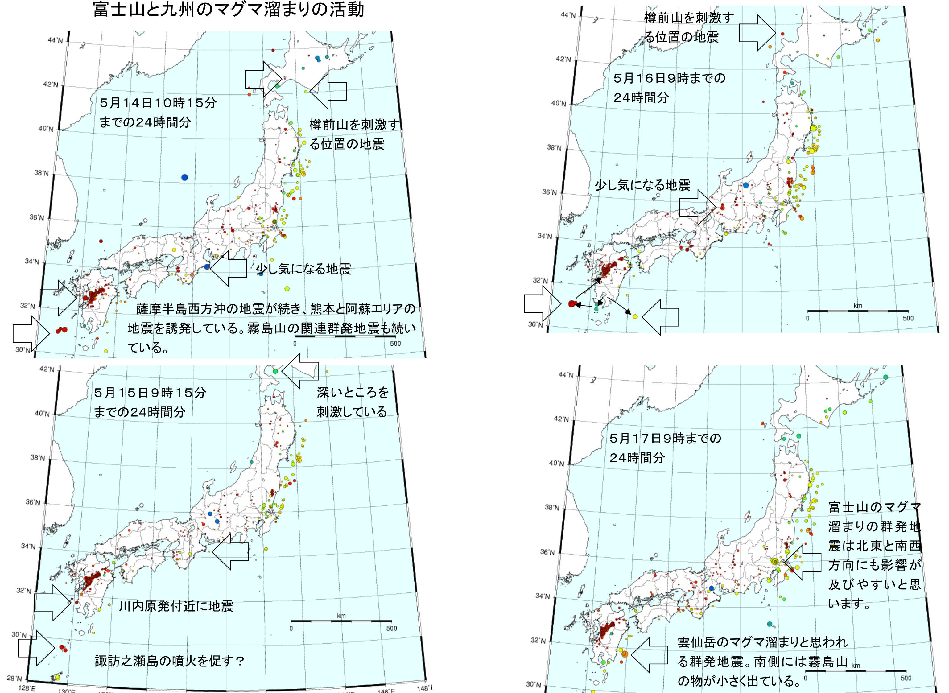 桜島は活発であり、薩摩半島の南側に深発地震を起こし、薩摩半島西方沖に群発地震を起こしてから、熊本と阿蘇エリアを刺激しています。動きがパターン化して来ており、この順番で地震が起きていることを確認頂けると思います。