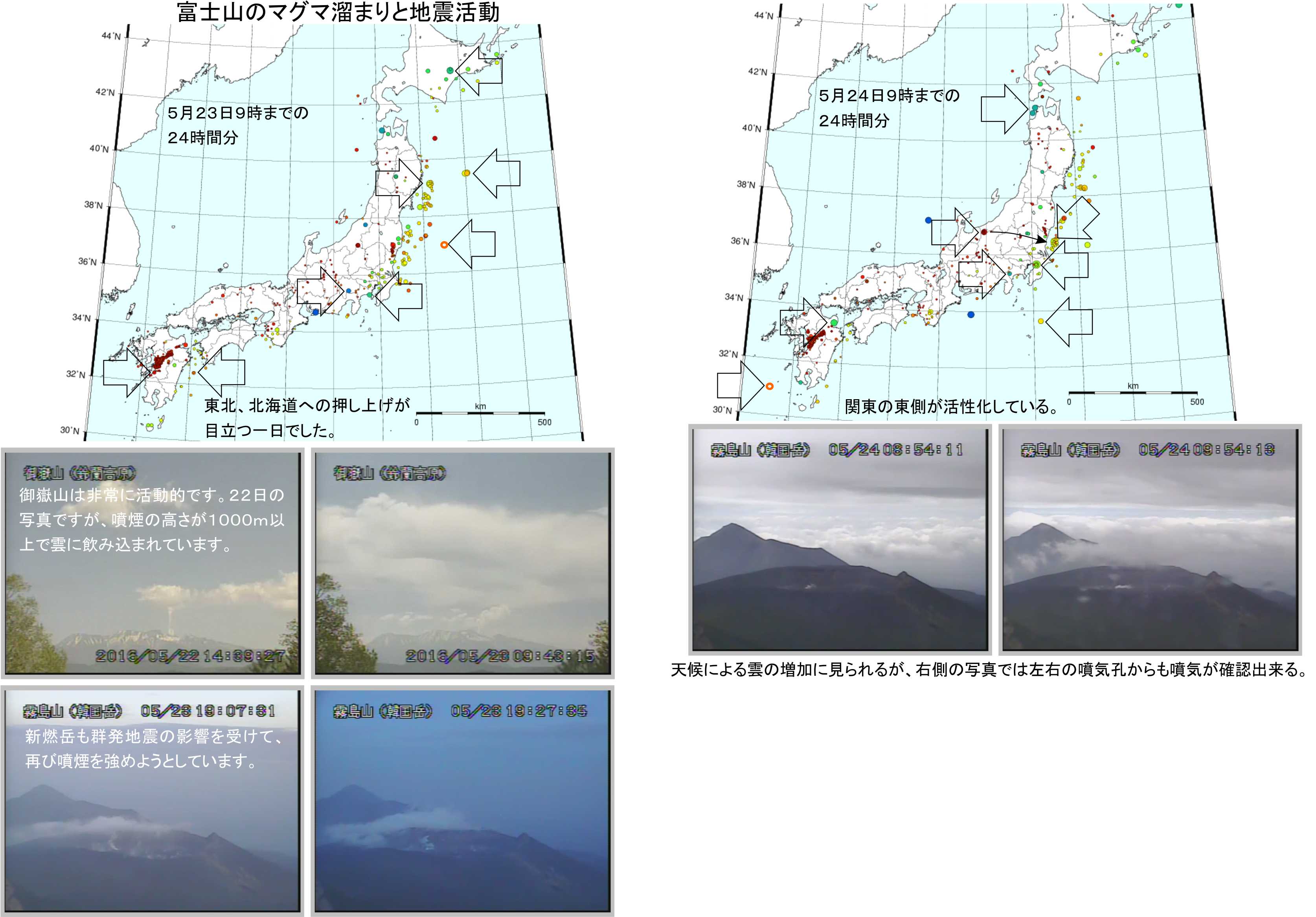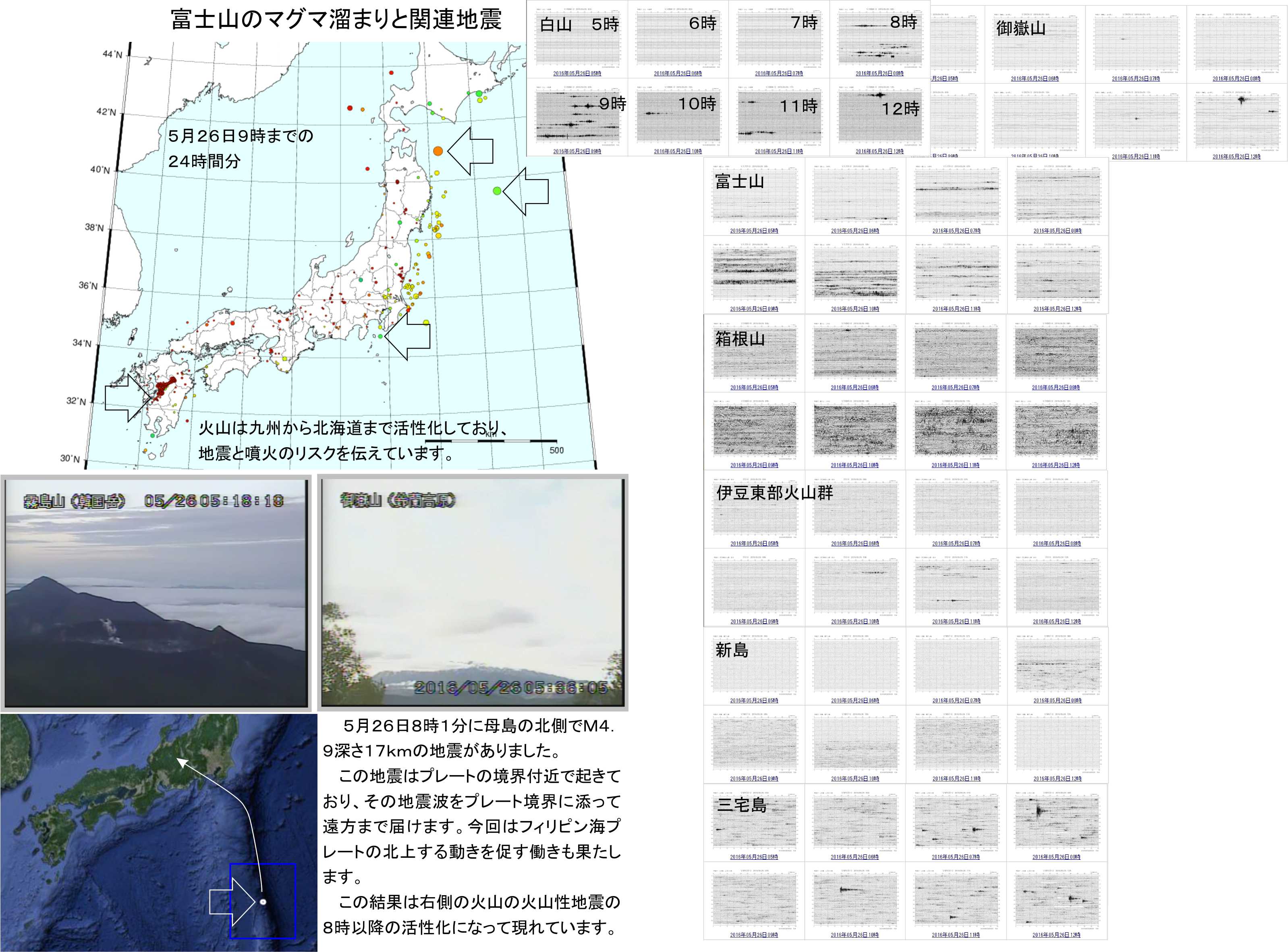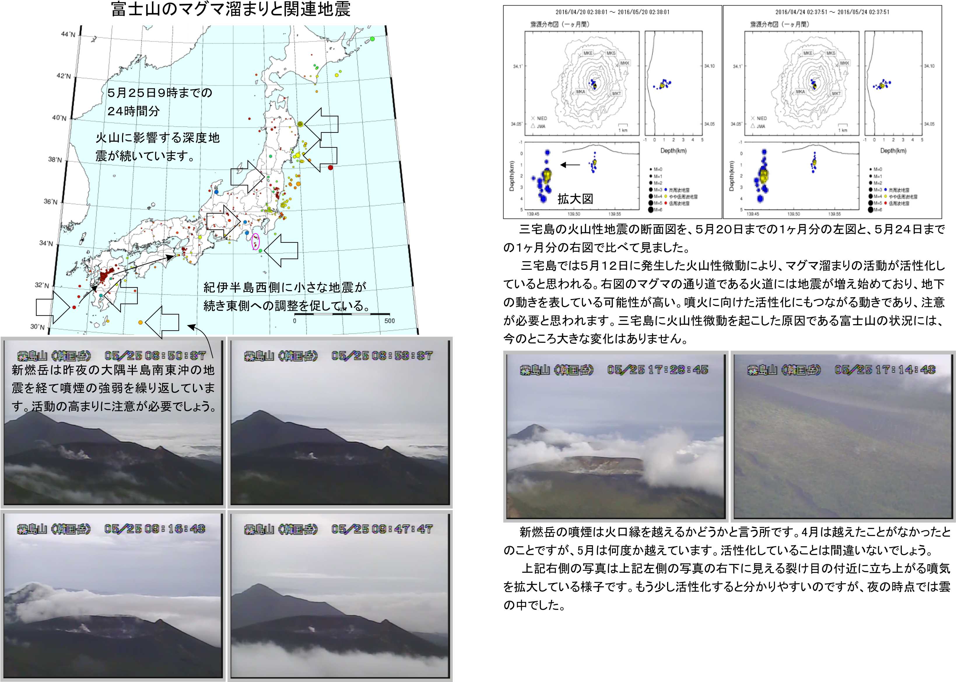 大きな変化なく時が過ぎています。どこに変化が出るのか調べていますが、まだよく分かりません。三宅島のマグマ溜まりが富士山の5月12日の活動により刺激を受けた話を書きました。御嶽山は同じ時期に噴煙を強めています。白山も火山性地震にマグマ溜まりの潰れを示唆する変化が同時期に現れていました。フィリピン海プレートの押しが大元の原因と思われるこの分に気づいたのですが、こうなると南海トラフの連動のメカニズムの一部になり得ることが分かります。
