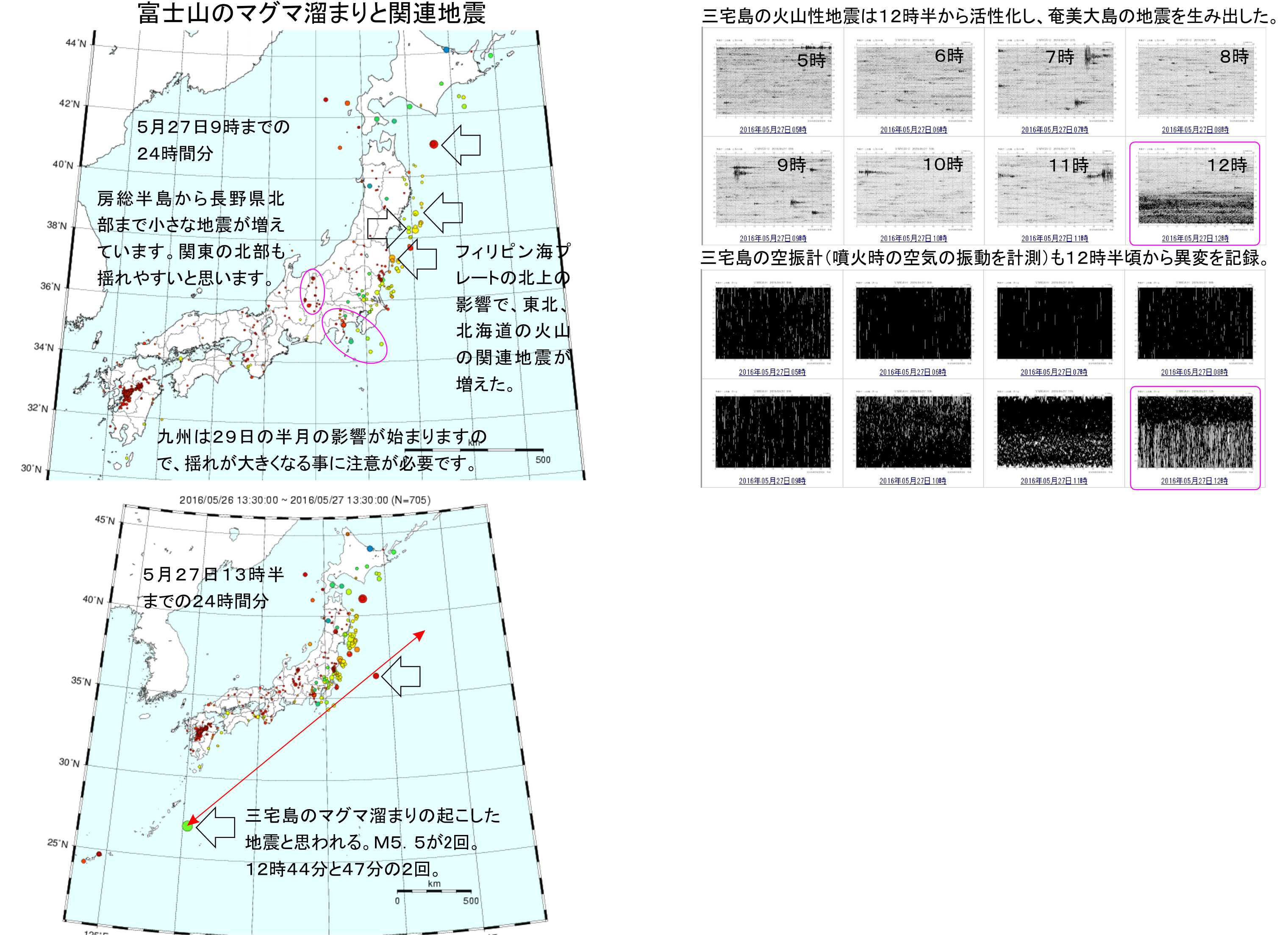 今回は富士山のマグマ溜まりに加えて三宅島も火山性微動に現れるように活性化しています。伊豆東部火山群は昨日から今日にかけてM4クラスですが、群発地震を起こしています。これらが同時に動くようであれば、広域に連動地震が引き起こせるでしょう。