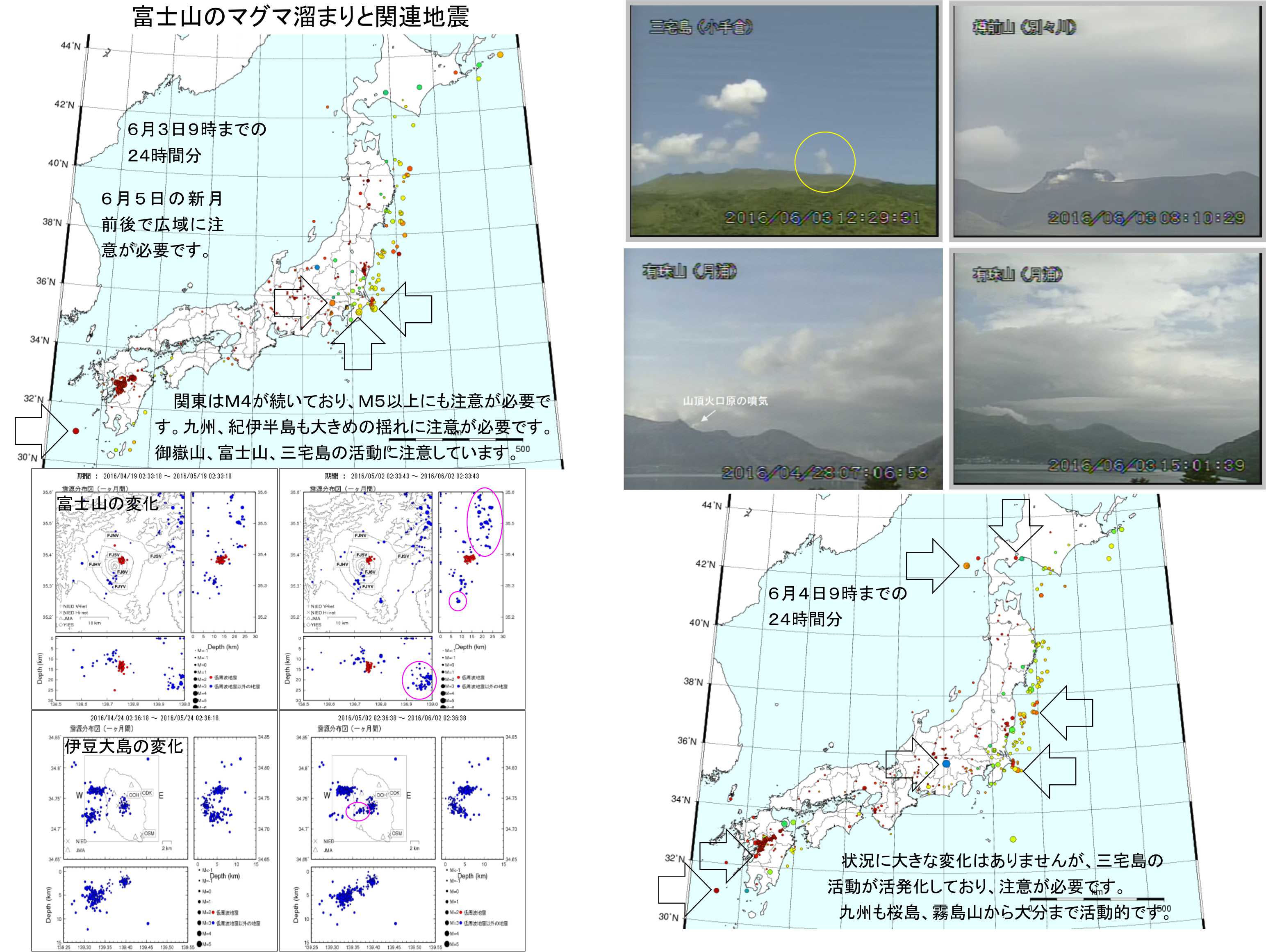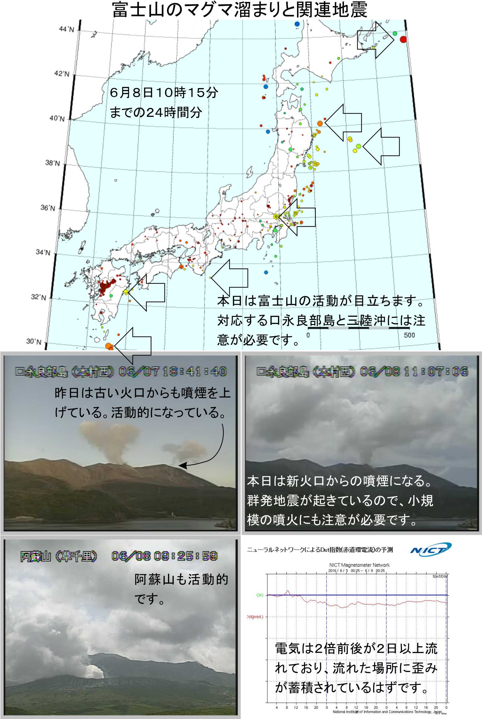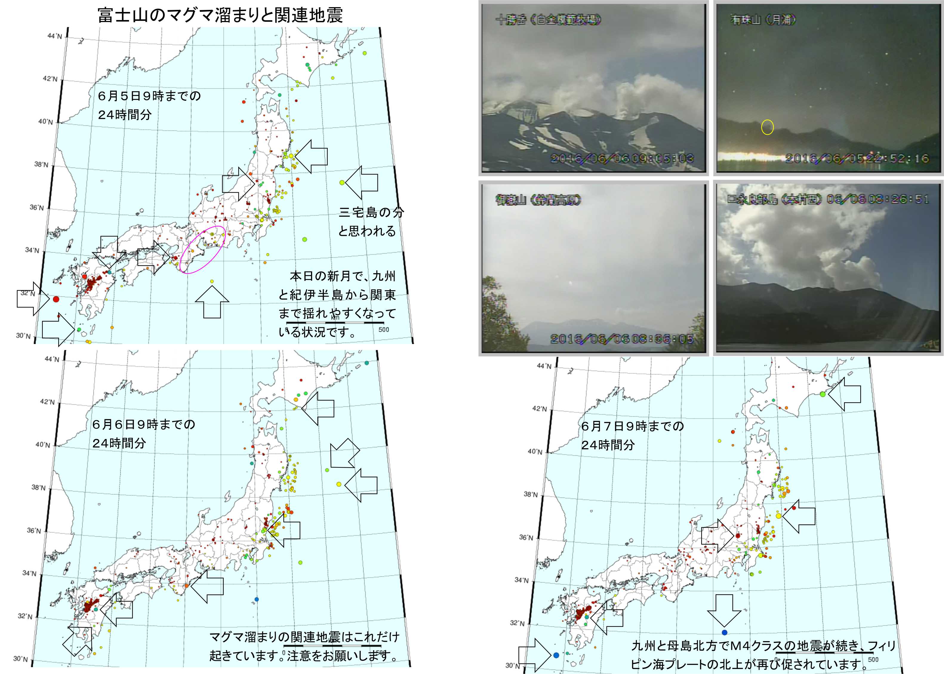 マグマ溜まりの活動はそれなりに高まっており、秋田駒ヶ岳、栗駒山、霧島山、桜島の群発地震の位置には地震が起きています。今のところ大きな物にはなっていませんが、富士山、三宅島、御嶽山、阿蘇山の活動には注意をお願いします。