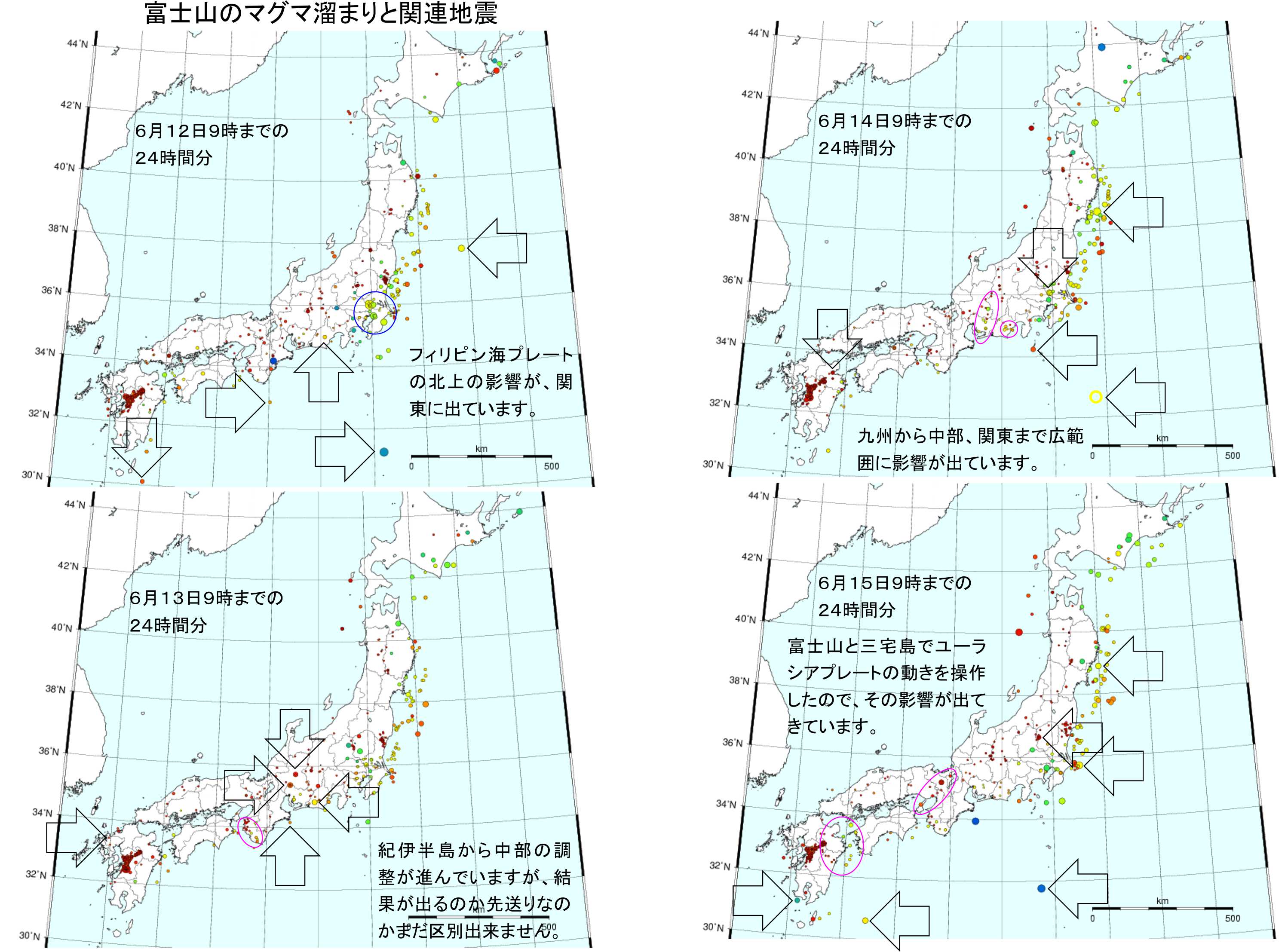 関東のマグマ溜まりは小さな地震を起こし続けており、活動的な状況に変わりはないと思っています。三宅島が起こし続けた奄美大島東方沖の地震は丸一日以上停止しており、今後の変化に注意している状況です。