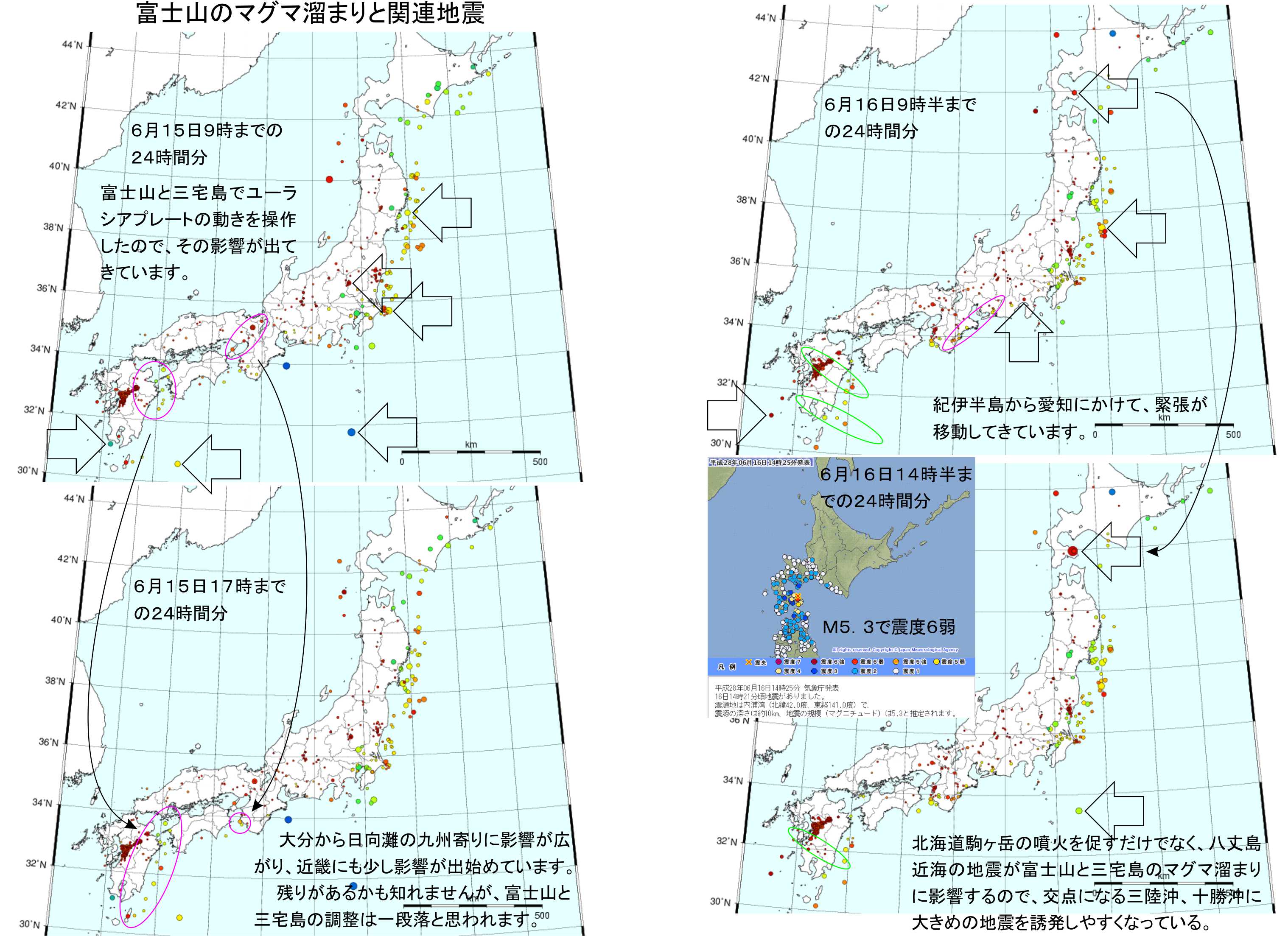 本日のイラストには九州でマグマ溜まりに影響を受けた部分を緑の楕円で描いています。昨日書いたように桜島にも群発地震が増えており、噴火の予想をしています。