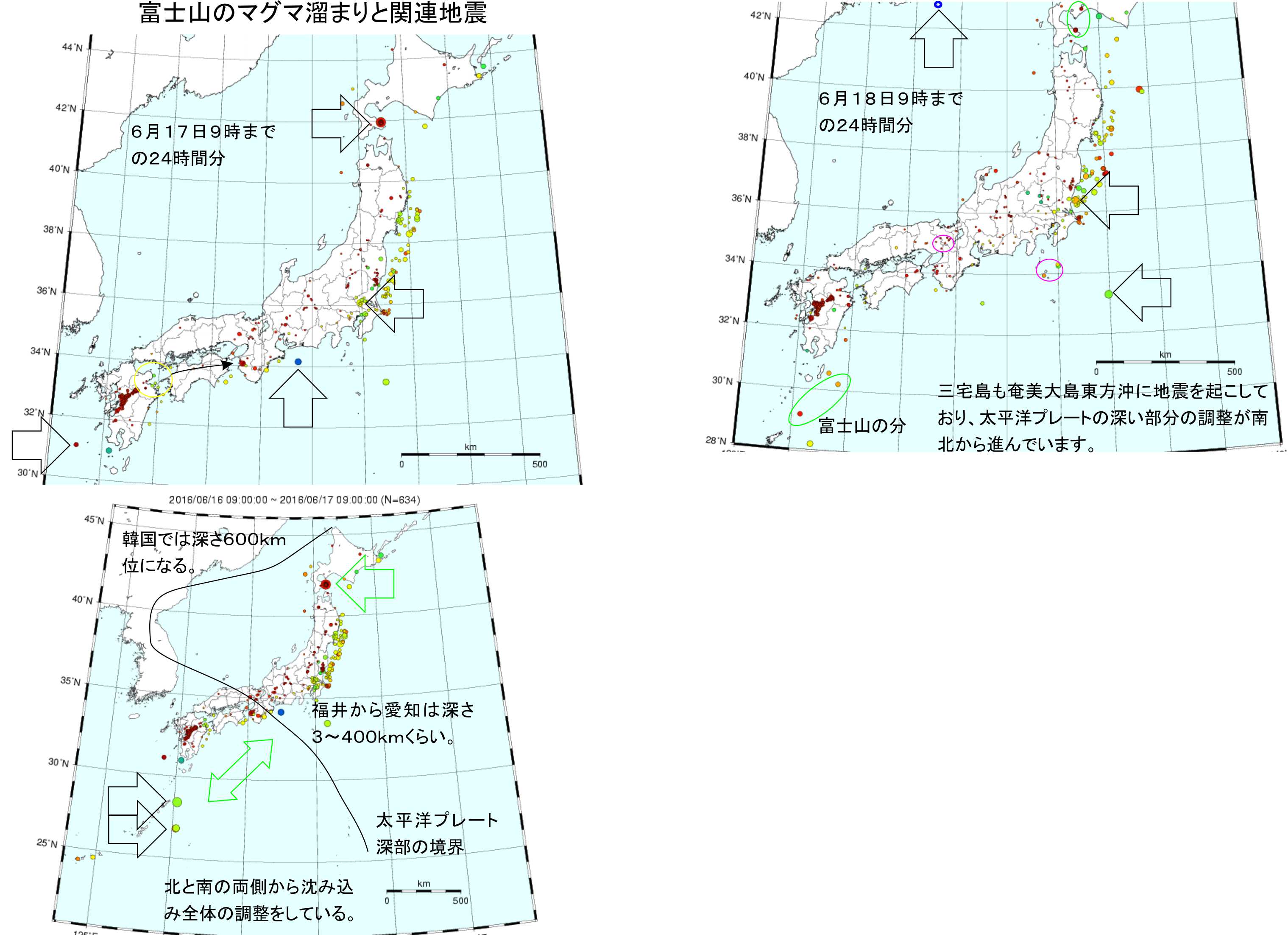 富士山も三宅島も琉球列島に地震を起こし続けており、太平洋プレートの深い部分へ南側からの調整を続けています。
