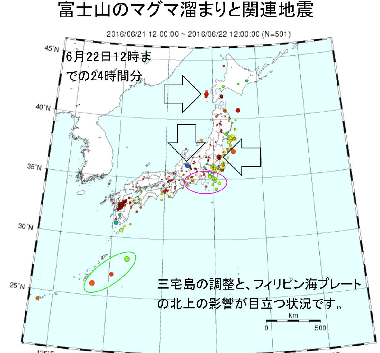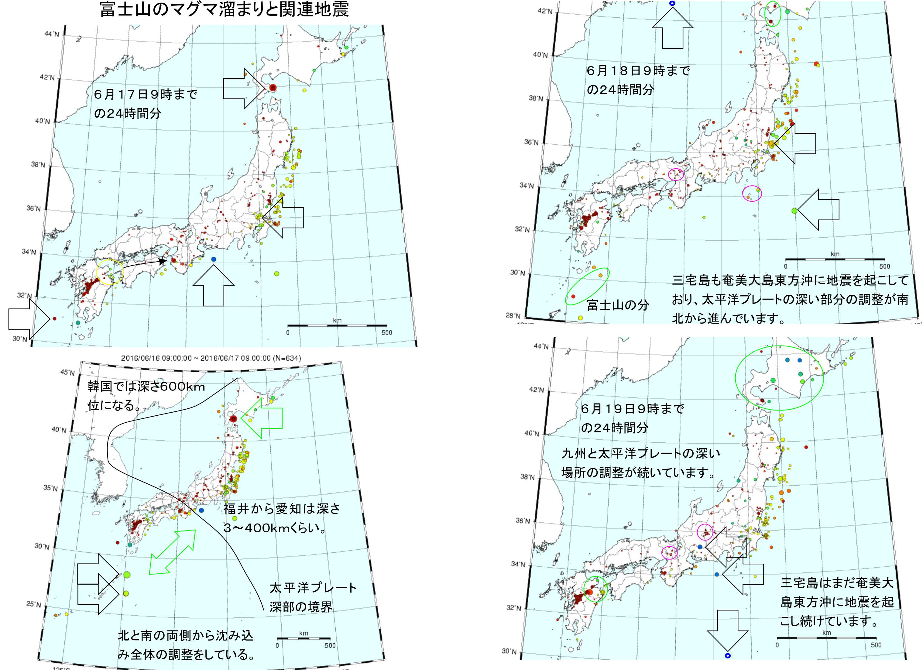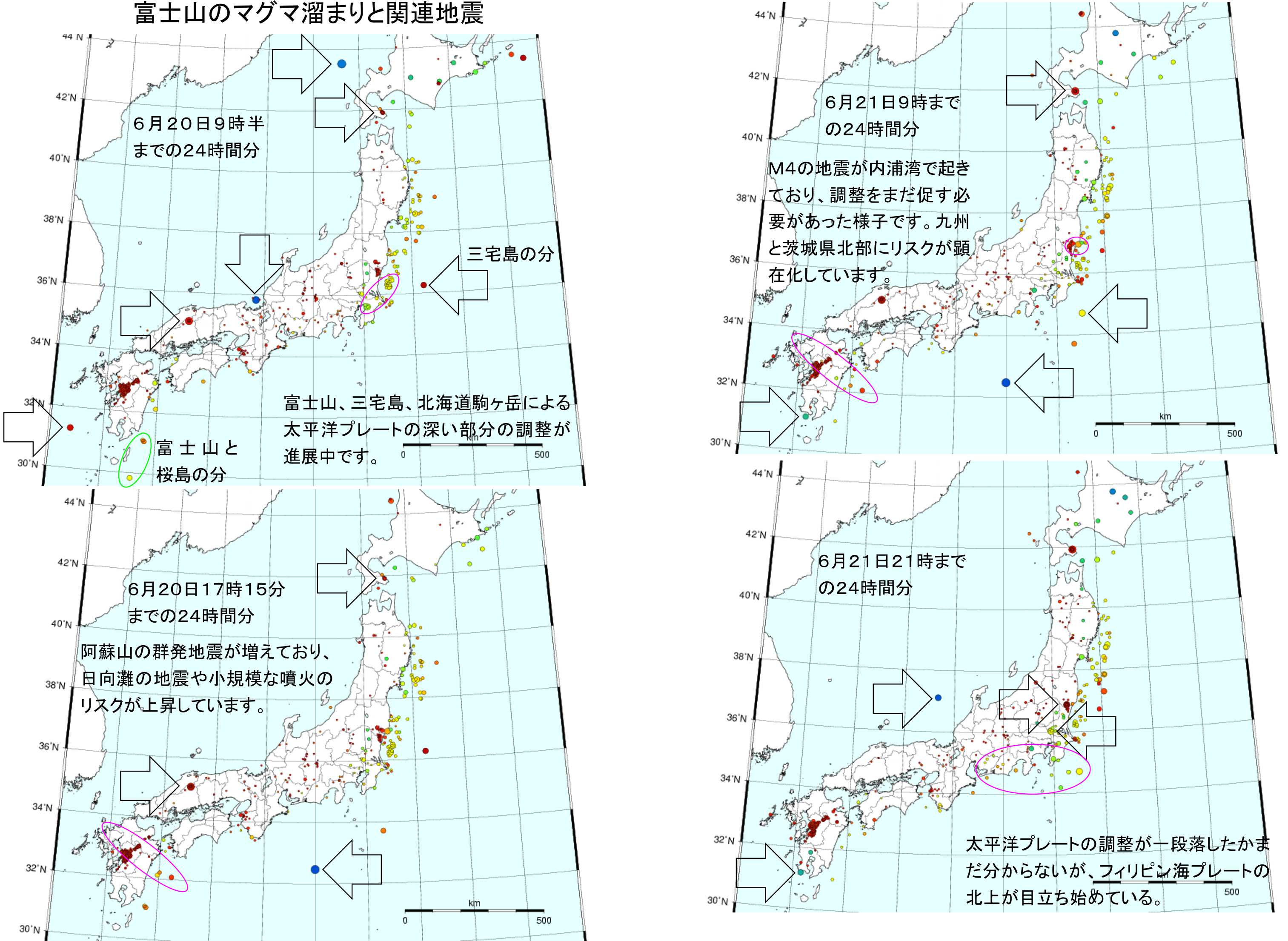 太平洋プレートの深い部分の大がかりな調整であり、日本の火山に影響が出やすい状況です。調整が一段落するまでマグマ溜まりの活動には注意が必要です。明日の満月の前後はマグマ溜まりによる上下の揺れが大きくなりやすいので注意しています。