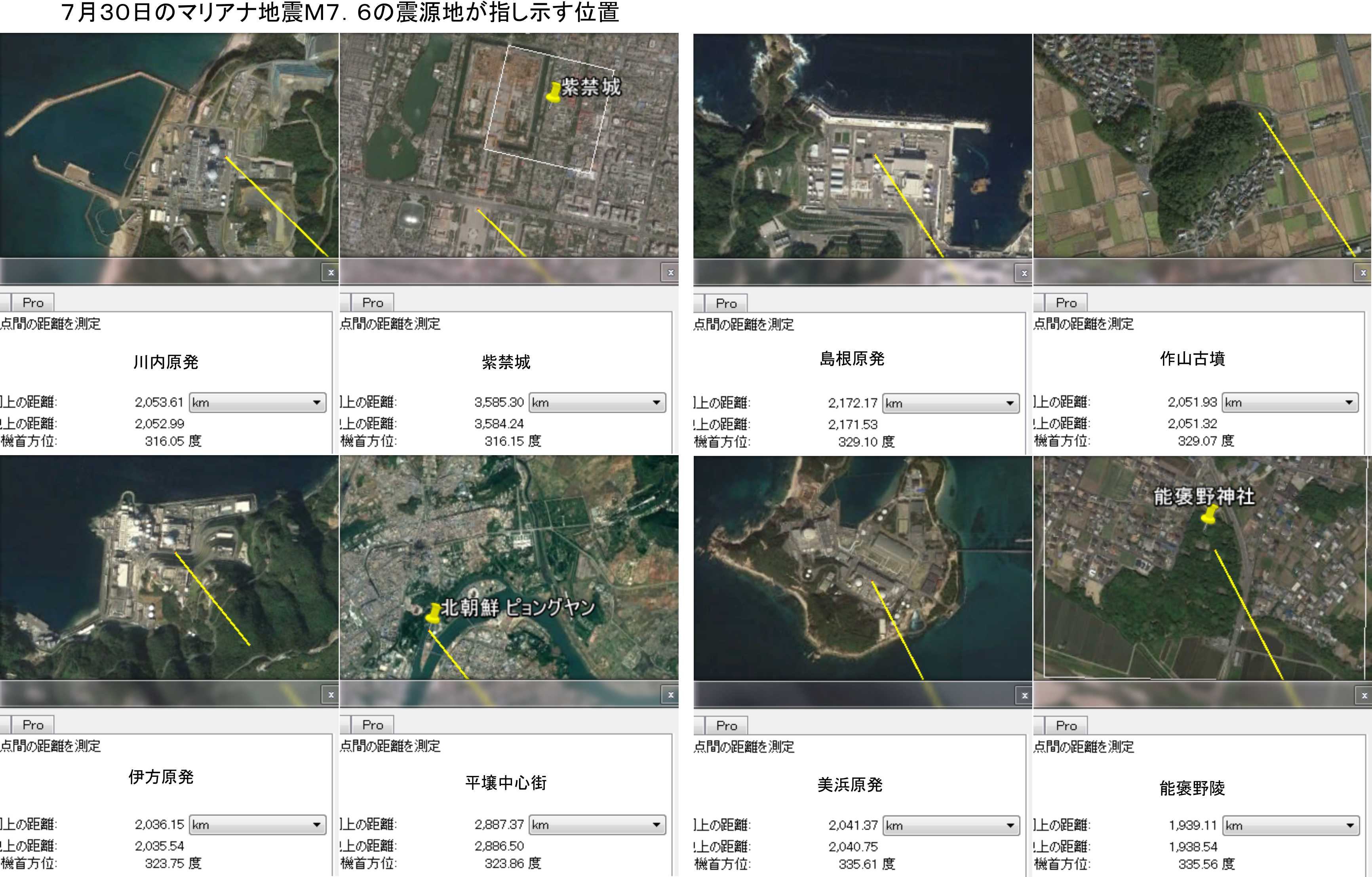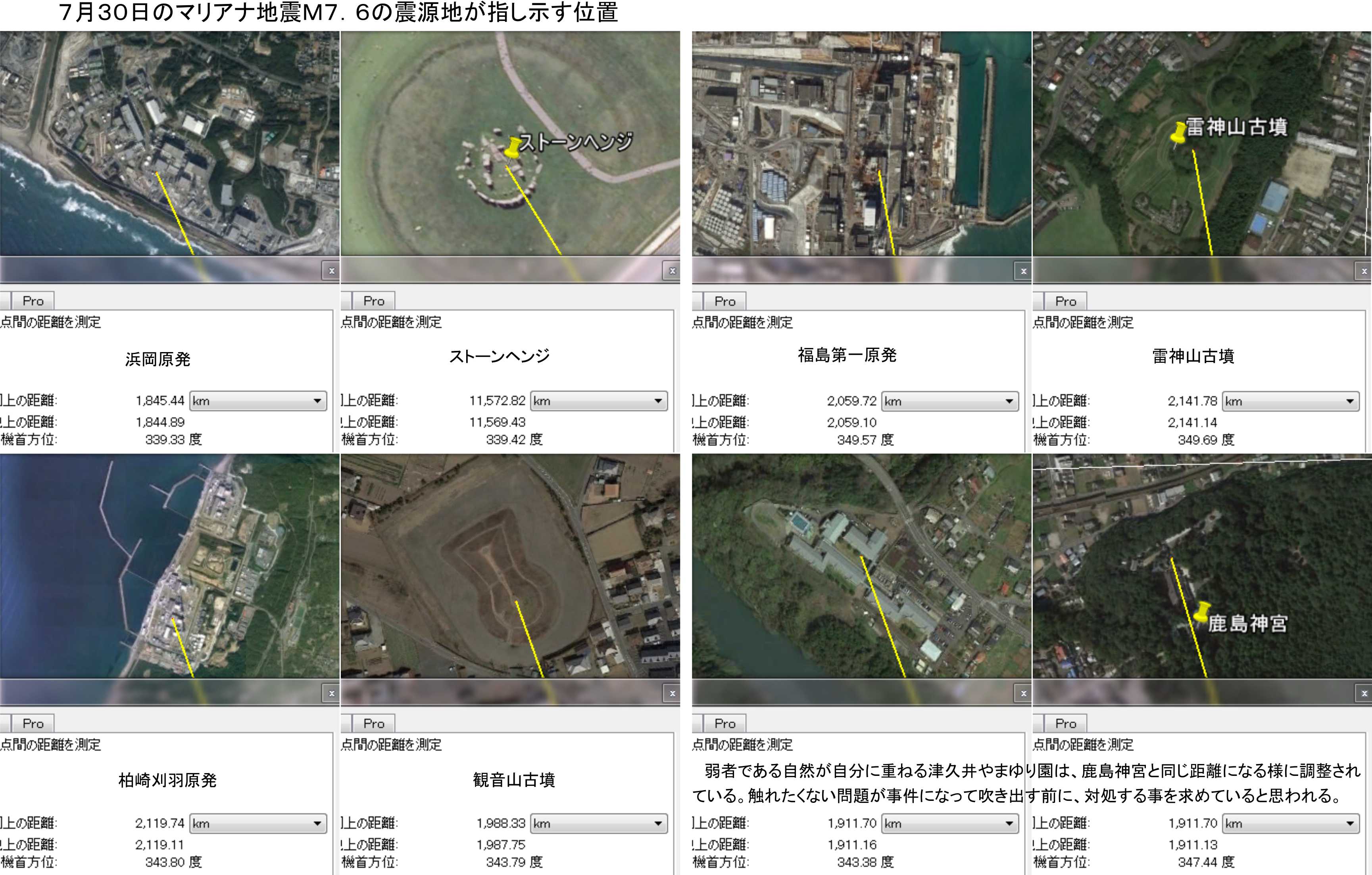 7月30日に起きたマリアナ諸島のM7.6の地震は、その発生位置を通して、日本の全ての原発の位置を明確にする情報を伴っています。海外の遺跡の位置に合わせたり、国内の大型古墳に位置を合わせています。イラストを参照下さい。位置のリストは文末です。