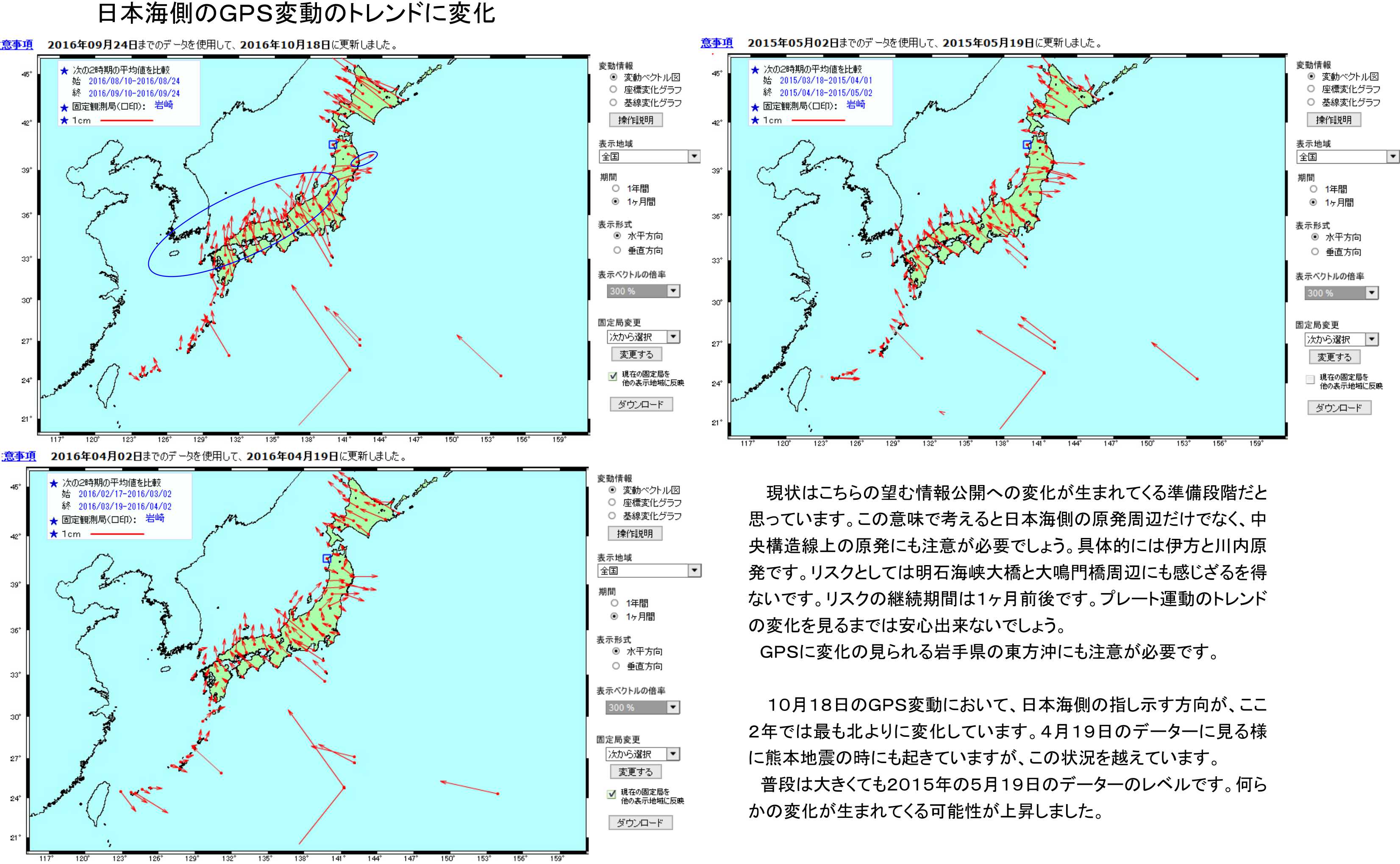 実際にどのエリアにリスクが高いのかは、よく分からないです。伊方、玄海、川内原発は区別が難しいです。満月の前日の10月15日に熊本エリアで地震が群発しており、満月で東西の地殻の動きが生まれにくい時を狙って、10月8日の大きめの噴火で生まれた歪みを抜き出しています。この意味では自然は大きな配慮をしながら調整を続けており、この一環が日本海側の大きな動きに現れていると思います。