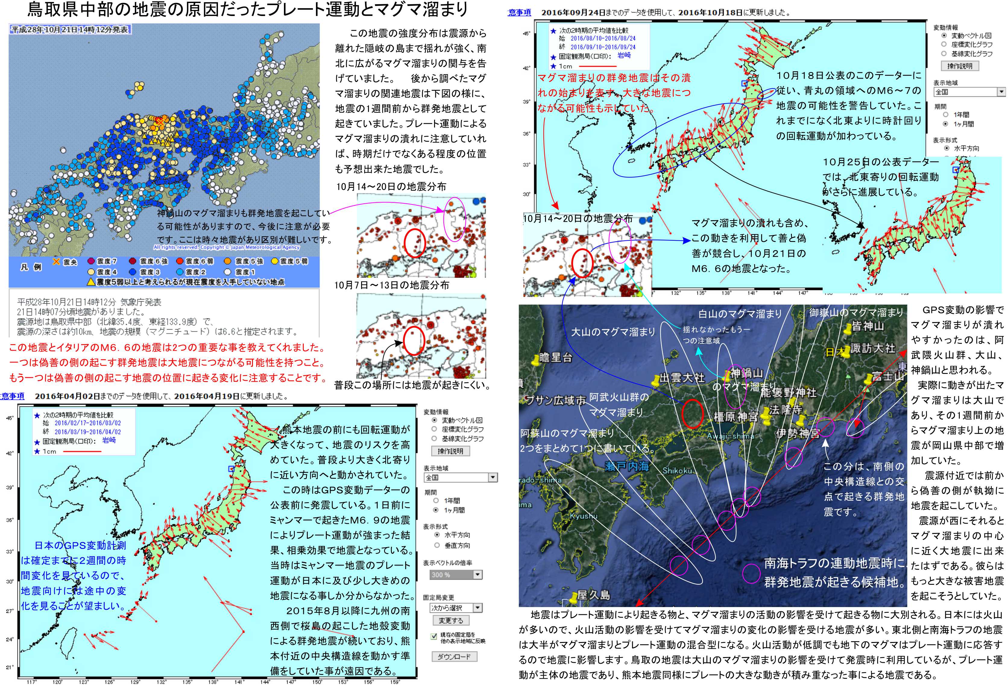 10月21日の鳥取県中部の地震のこちらの予想は、広域に渡る物でした。これまでにないGPS変動が起きていた領域を一通りカバーする警告を19日にしています。18日のGPS変動データーの公表に合わせた対処でした。