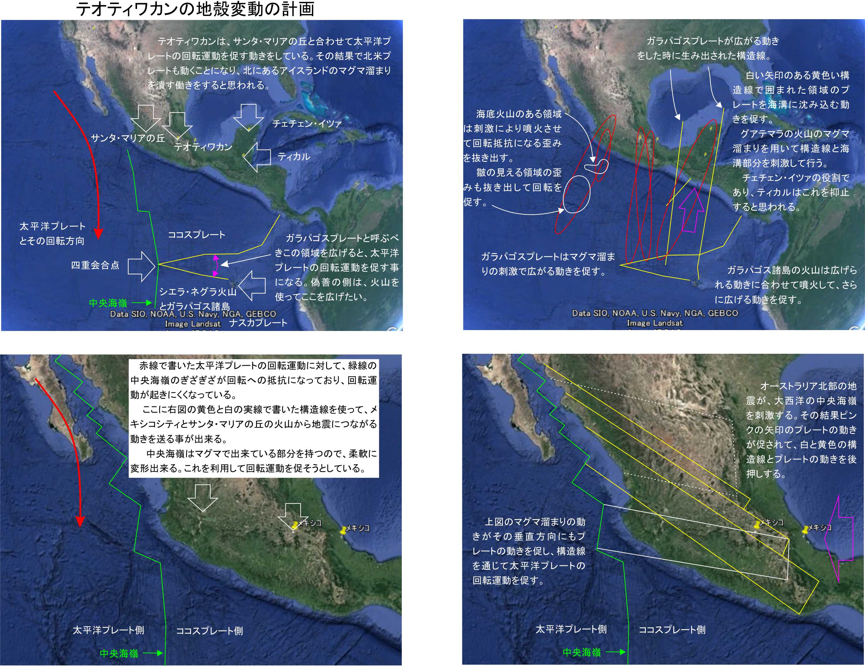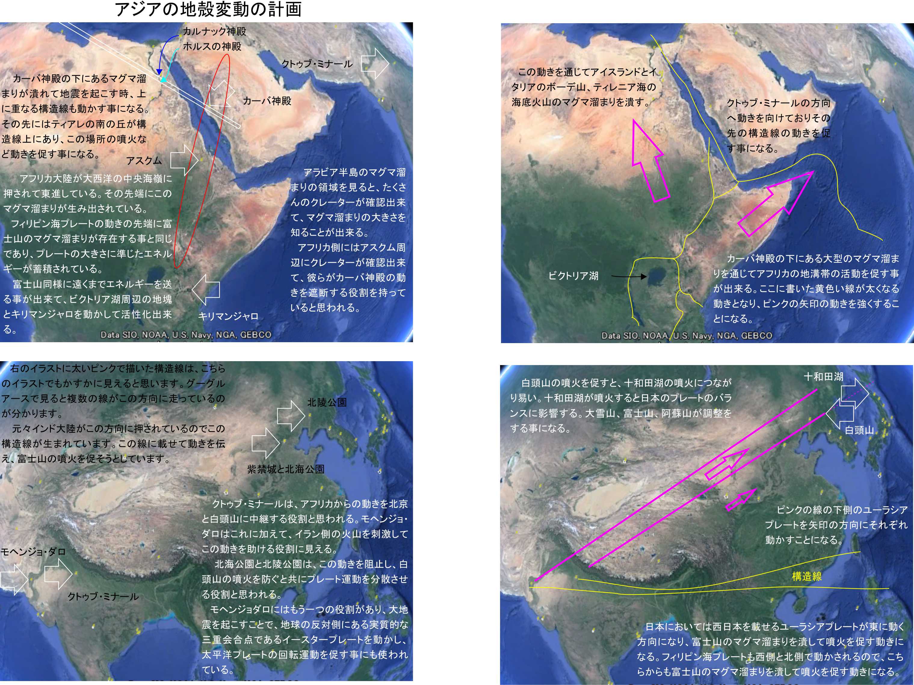 これだとどの様に地殻変動を引き起こすのか分からないので、対策を考えるためにその具体的な方法を検討していました。こちらが自然の意図を地震と台風の中に位置と時刻の情報として見いだした2016年の7月以降、善と偽善の自然における争いが明確になり、その中で様々な情報を教えられました。今回の記事は彼らの教えた情報を元に地殻変動の起きる流れを説明する為の物です。ここでは例を示す物であり、説明する出来事の順番も組み合わせも、かなり自由に変えられるはずです。この記事はこれまでの情報から未来に備える為に基本例を提供する物であり、今後世界の遺跡から関連情報を調べて計画を統計的にも明確にする必要があると思います。多くの人の手による検討が重要です。