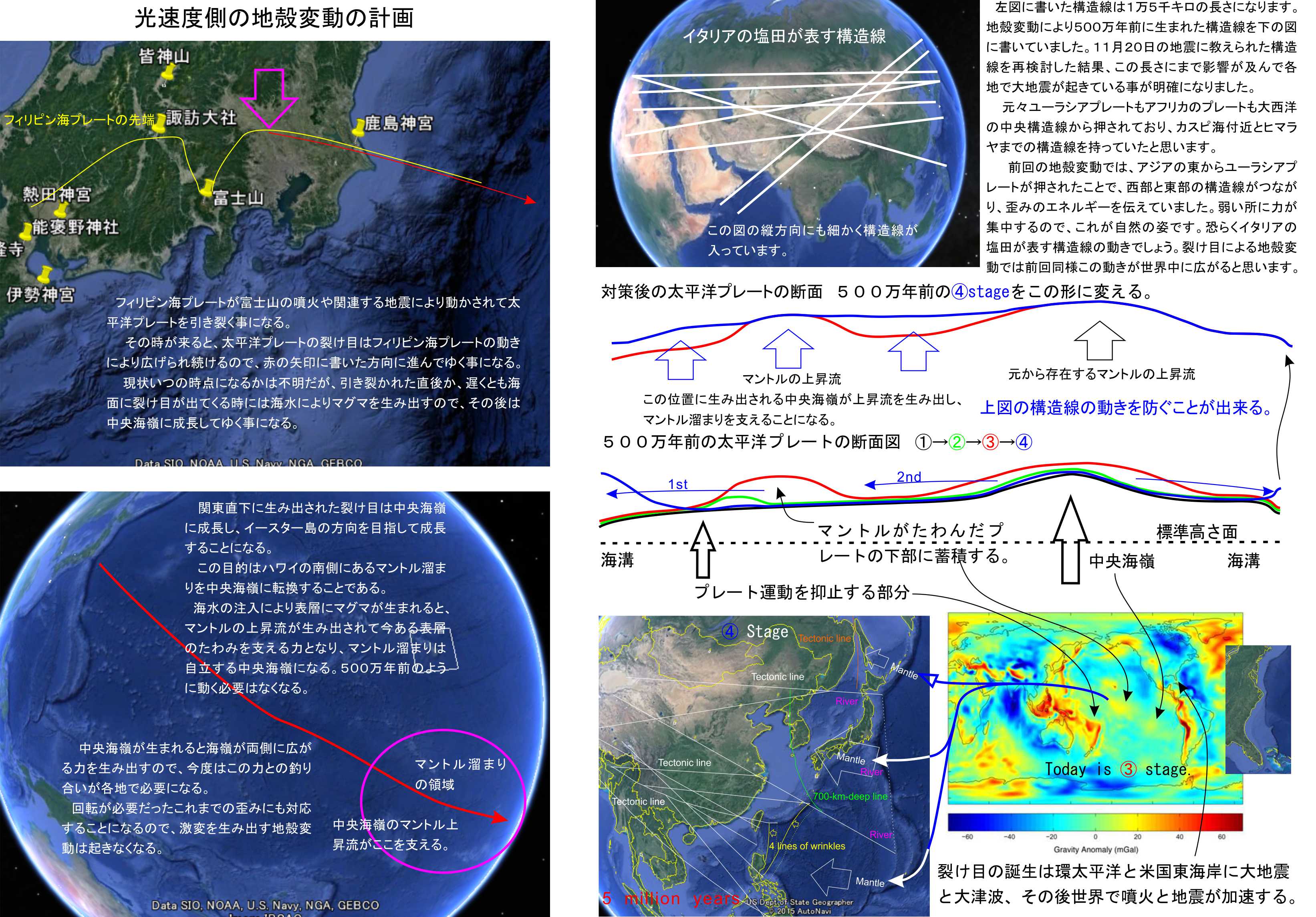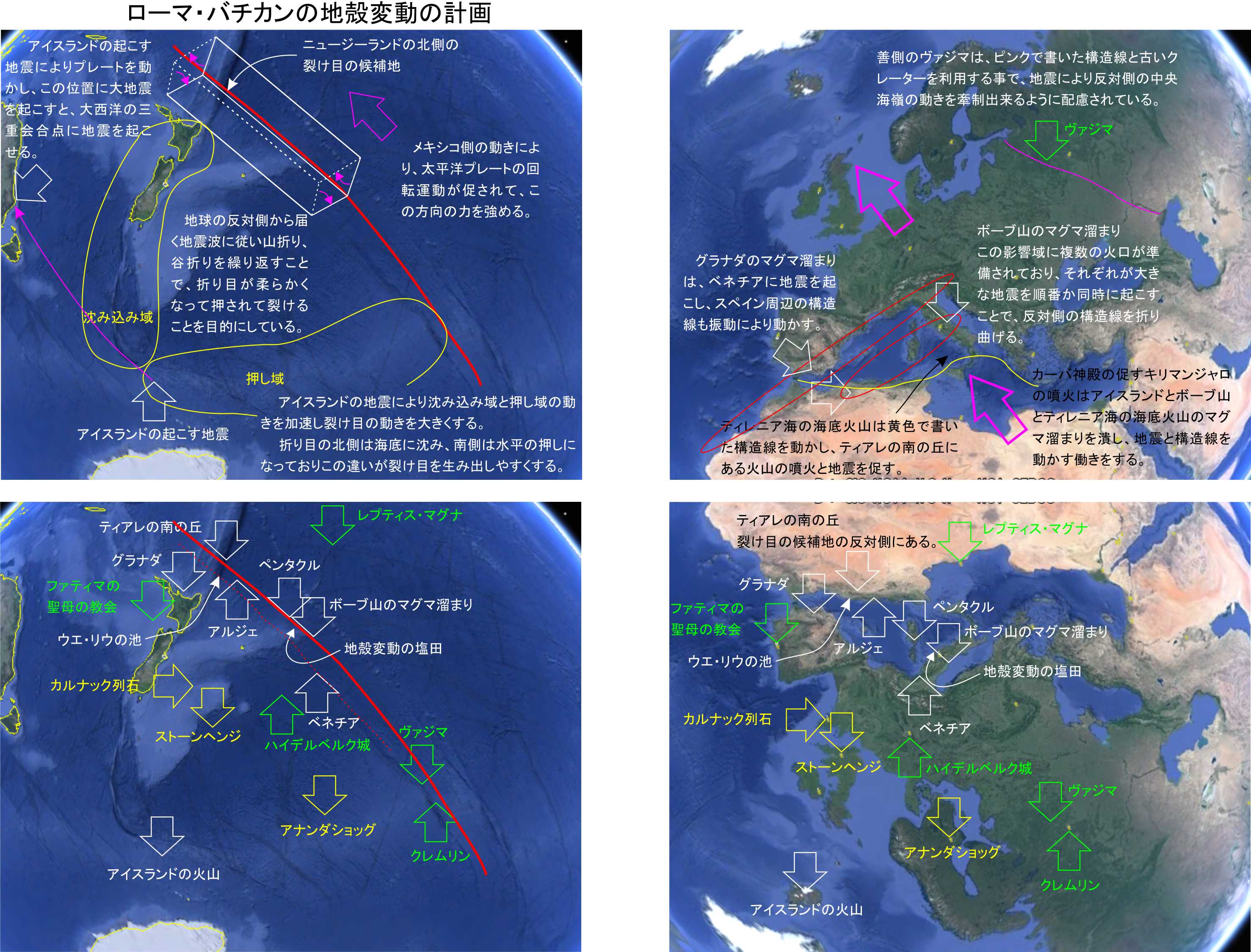 2049~75年の期間中にこのイベントを起こそうとしています。富士山の噴火のメカニズムは簡単に想像出来るのですが、世界の地殻変動ともなると、多くの人にはイメージが湧かないと思います。遺跡はニュージーランドの北側にあるプレートの裂け目の候補地と、千葉県東方沖にある中央海嶺の誕生場所を指し示しており、それぞれがその場所におけるイベントを望んでいる所までは分かっていました。