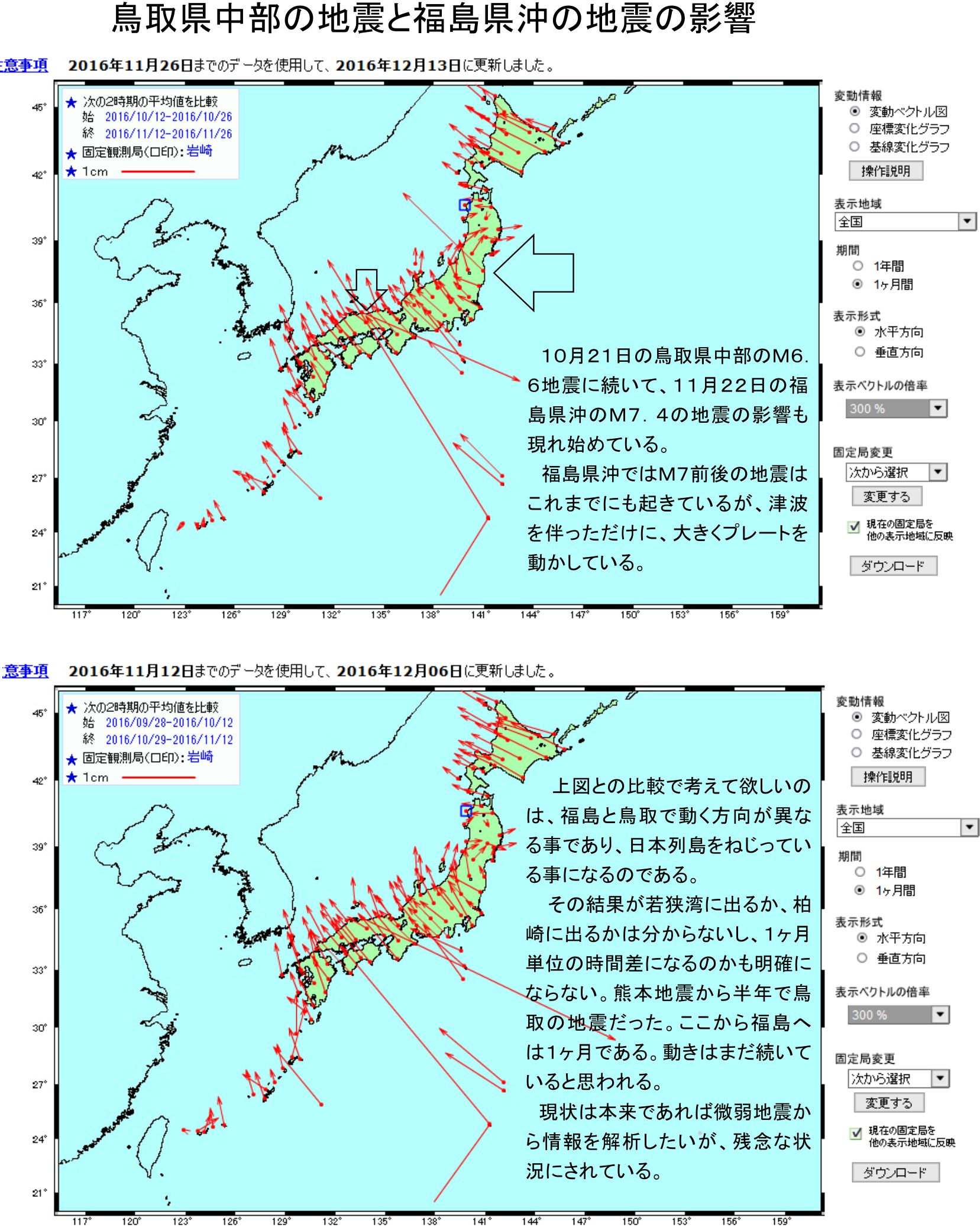 本日はGPSデーターの公表日で、11月22日の福島県沖のM7.4の地震の影響が確認出来ましたので紹介します。イラスト参照下さい。