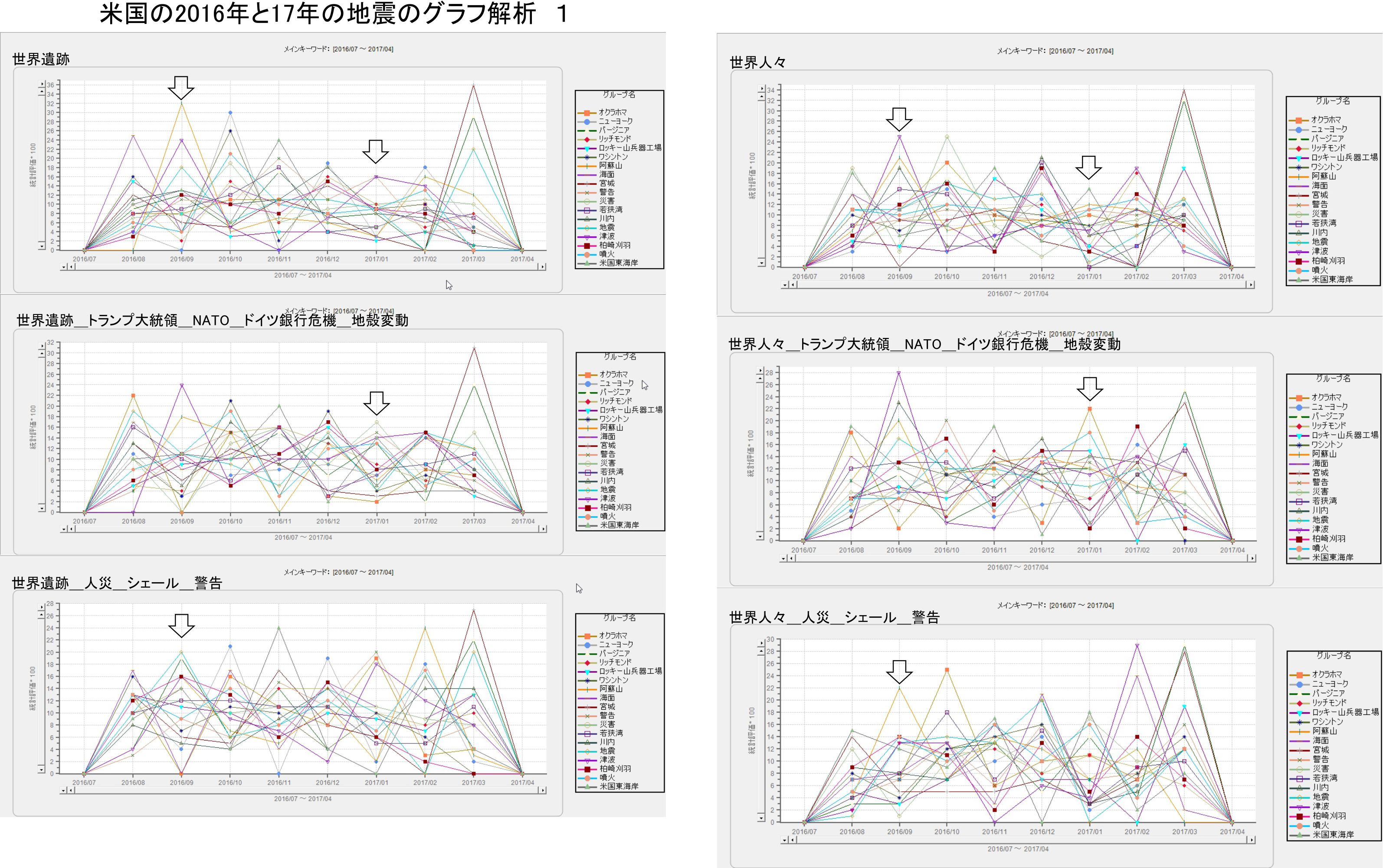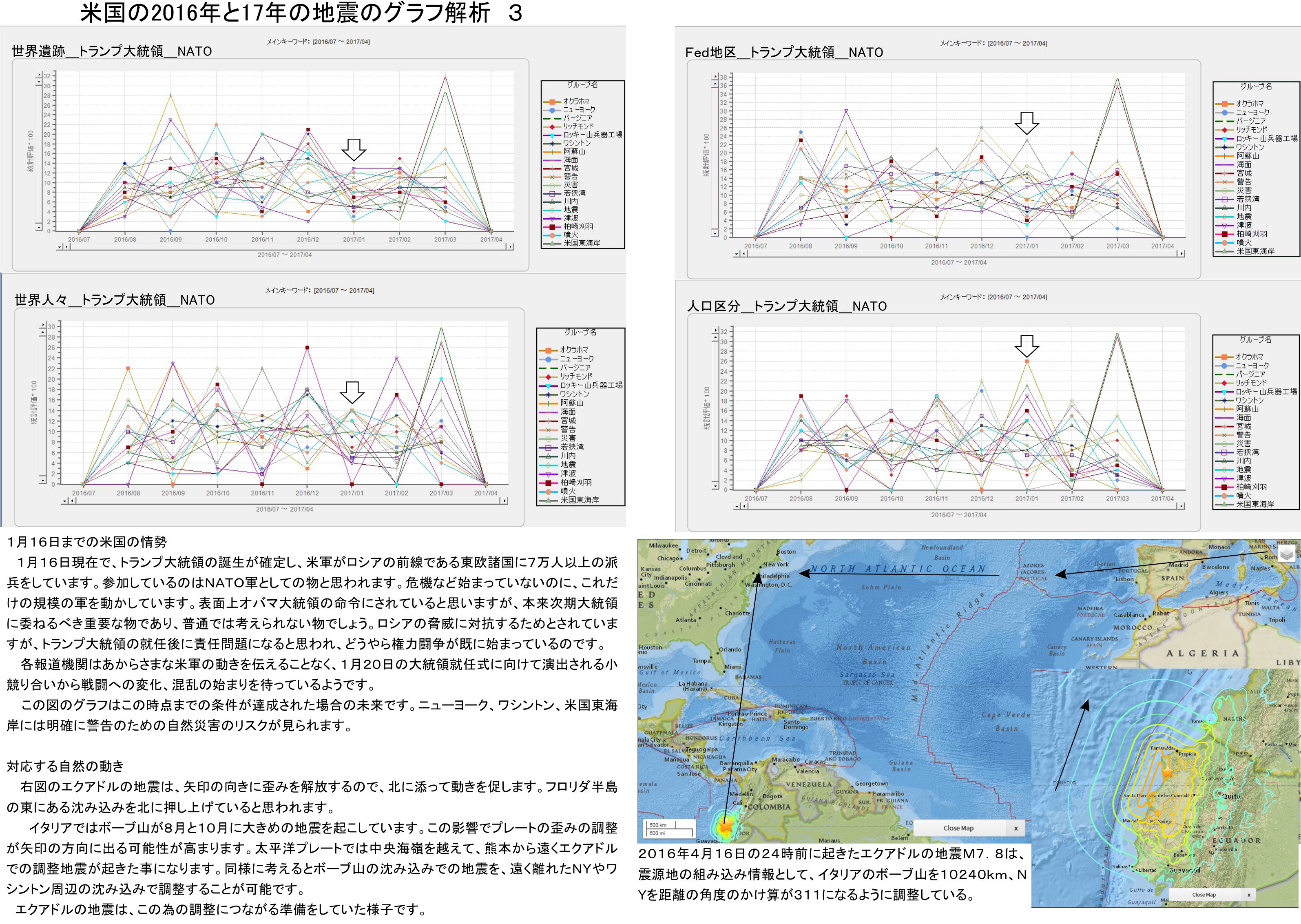 これに対して、2017年1月の状況は明確に異なります。始めから強調がされており地震津波何でもありの様子です。ここにトランプ氏の大統領就任とNATOの動きを加えるとさらに強調が強まる状況でした。この部分は3枚目のイラストを参照下さい。ニューヨークと米国東海岸の地震と津波、災害から警告までが強調されています。