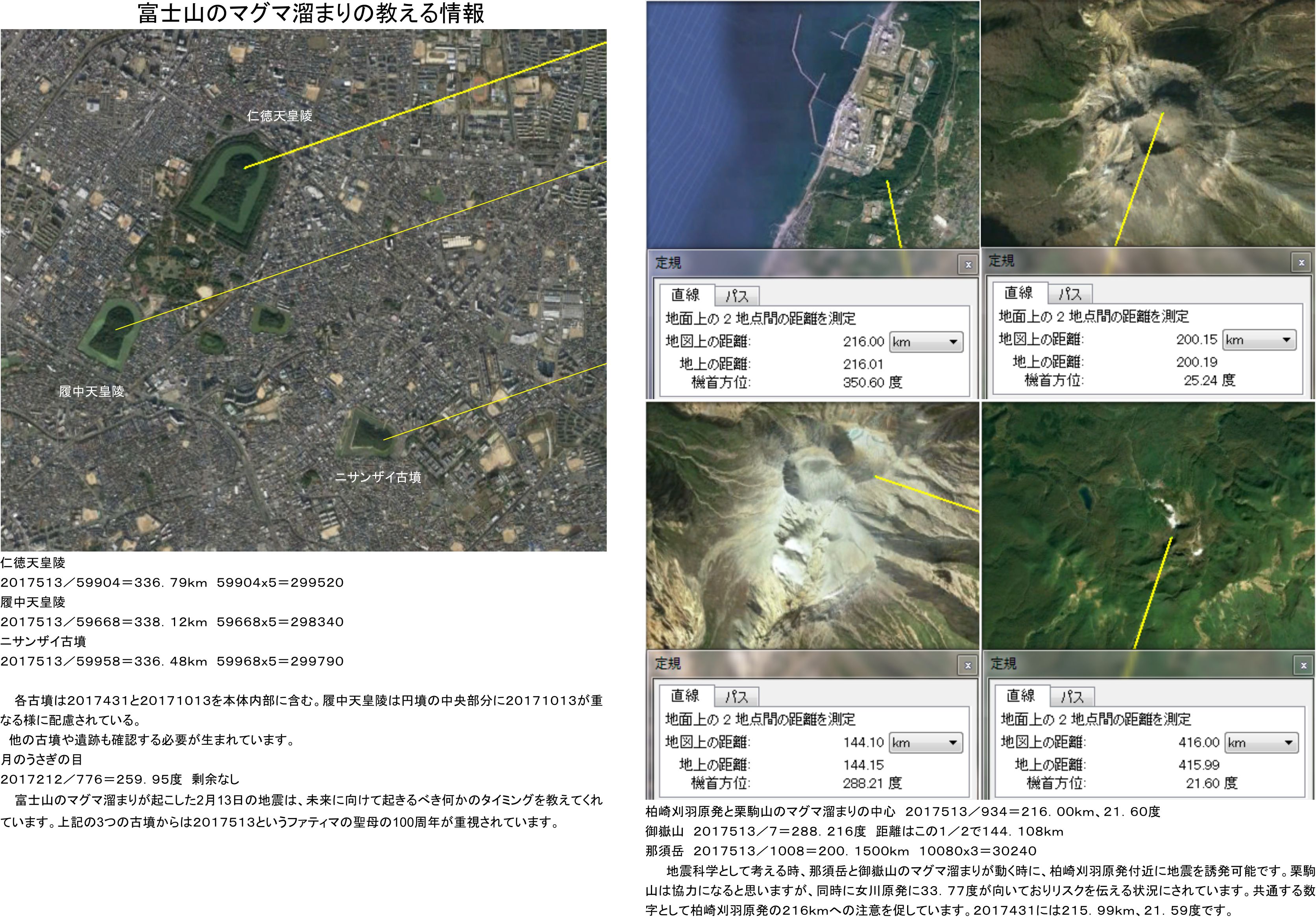 地震科学として考える時、那須岳と御嶽山のマグマ溜まりが動く時に、柏崎刈羽原発付近に地震を誘発可能です。栗駒山は協力になると思いますが、同時に女川原発に33.77度が向いておりリスクを伝える状況にされています。共通する数字として柏崎刈羽原発の216kmへの注意を促しています。2017431には215.99km、21.59度です。
