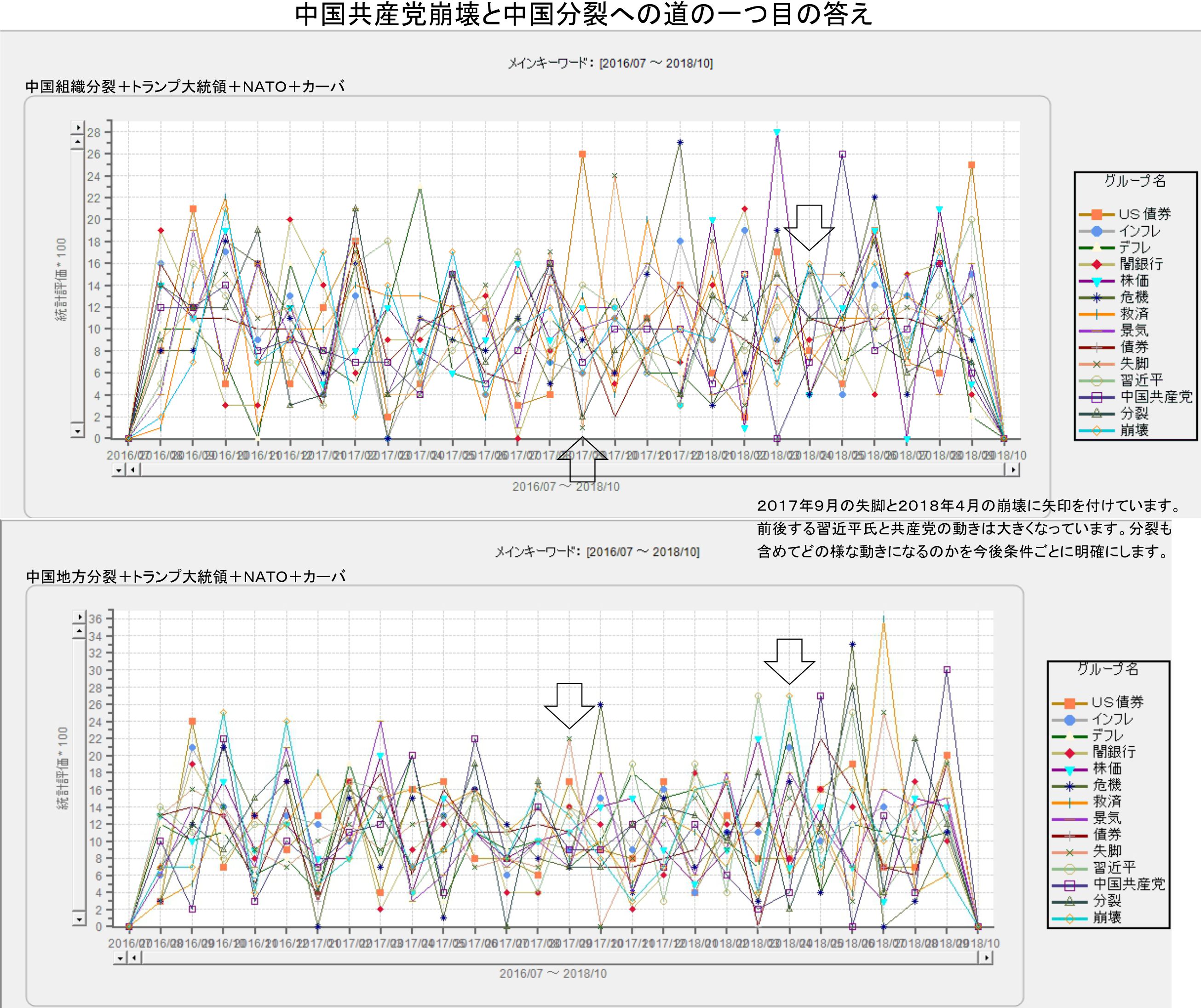 グラフ解析の結果をイラストに載せていますので参照下さい。中国の地方と中国の組織の2種類での解析結果です。トランプ大統領の誕生、カーバの登場、NATOの配備増強までを含んでいるイラストが、近未来を表しています。